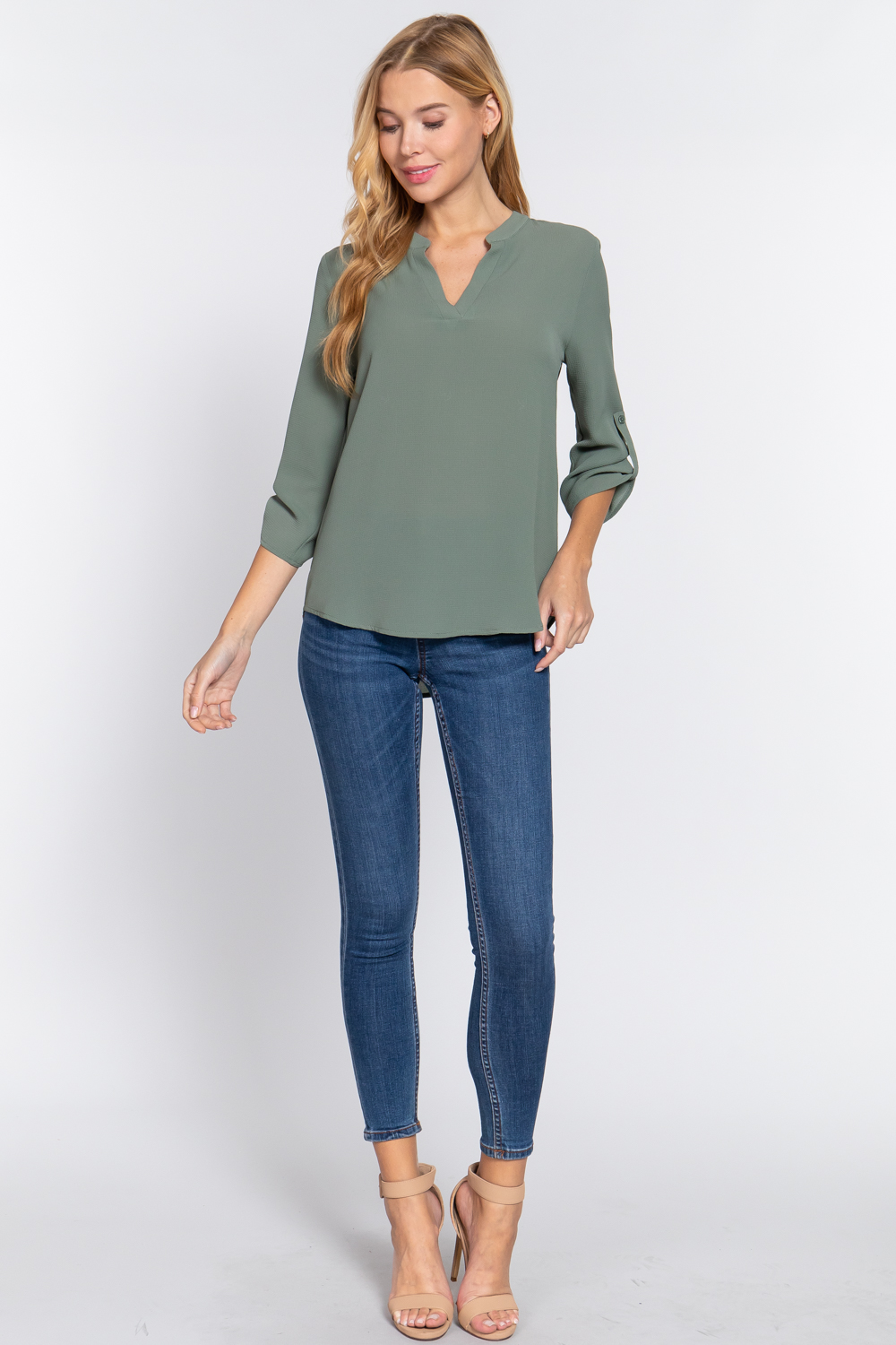 Product Description Imported S,M,L 3/4 ROLL UP SLEEVE V-NECK WOVEN BLOUSE 100% Polyester Sage Green LC16-07 Item Measurements: SIZE S Measurements: SIZE SLength:24" Waist:38" Bust:36"