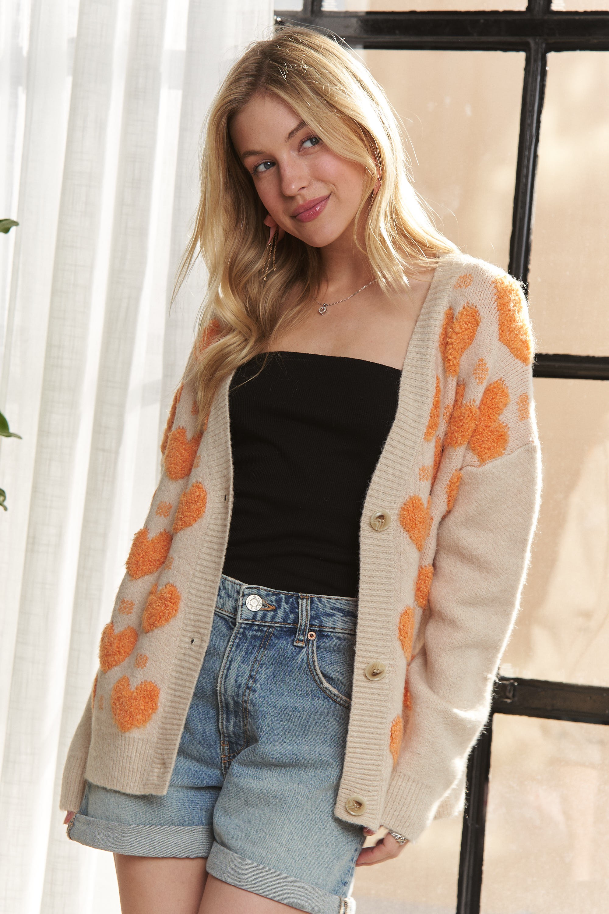 This heart sweater cardigan features a charming button-down design for a cozy and romantic look. The heart pattern adds a sweet and playful touch to the classic cardigan silhouette. Made with soft and warm fabric, this cardigan offers both comfort and style for chilly days. Elevate your wardrobe with this delightful and versatile piece that effortlessly combines cute detailing with a classic cardigan style.