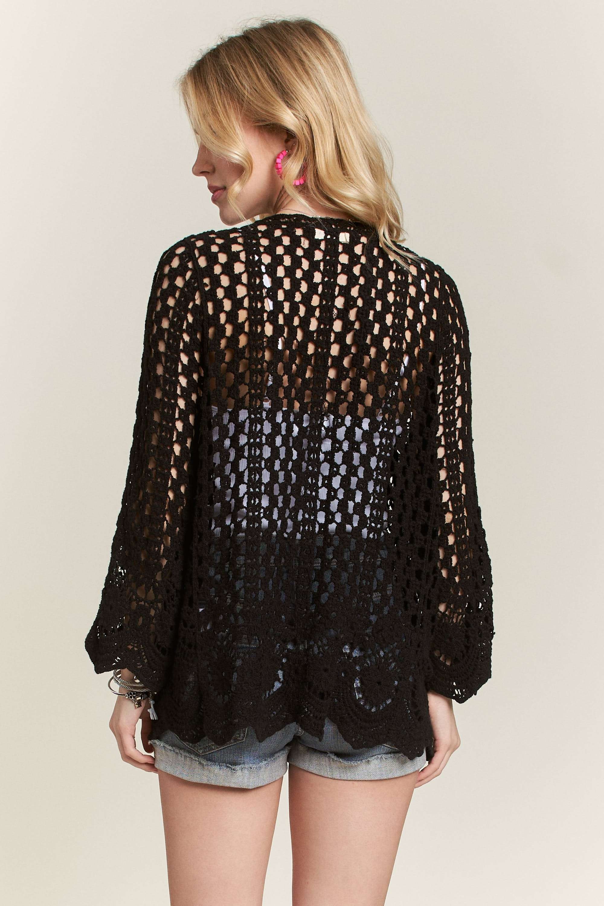 The crochet cardigan with scallop hem is a charming and feminine layering piece for your wardrobe. Featuring delicate crochet detailing and a scalloped hemline, it adds a touch of elegance to any outfit. This cardigan is perfect for adding a boho-chic vibe to your look, whether worn over a dress or paired with jeans and a top. With its versatile style and light material, the crochet cardigan with scallop hem is a lovely choice for an extra layer of warmth and style.