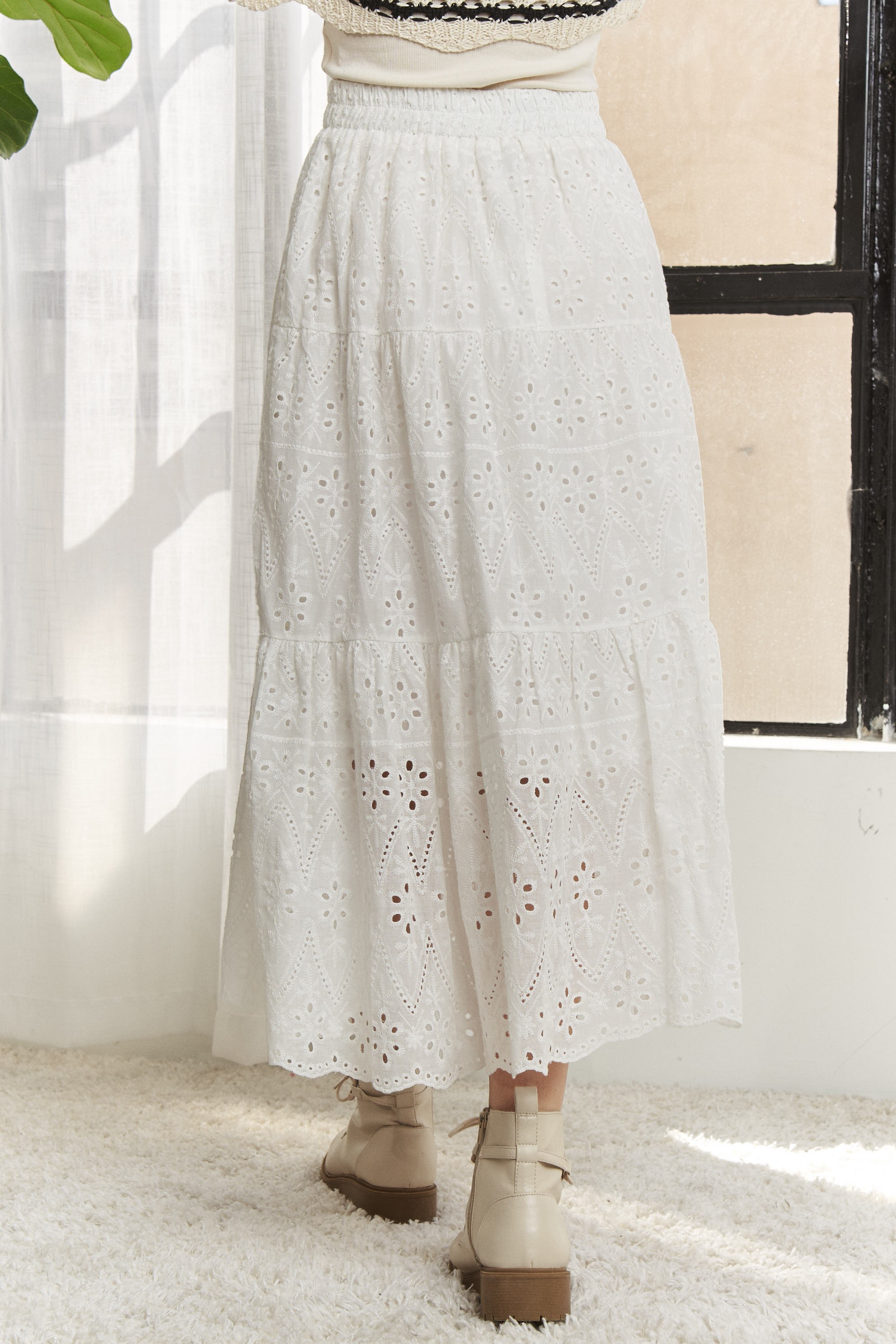 The elastic waistband tiered midi skirt is a versatile and comfortable bottom option featuring multiple tiers of fabric and an elastic waistband for a flattering fit. This skirt offers a flowy and relaxed silhouette that is perfect for various occasions. The elastic waistband provides ease of wear and all-day comfort, making it a practical and stylish choice for creating effortlessly chic and feminine outfits.