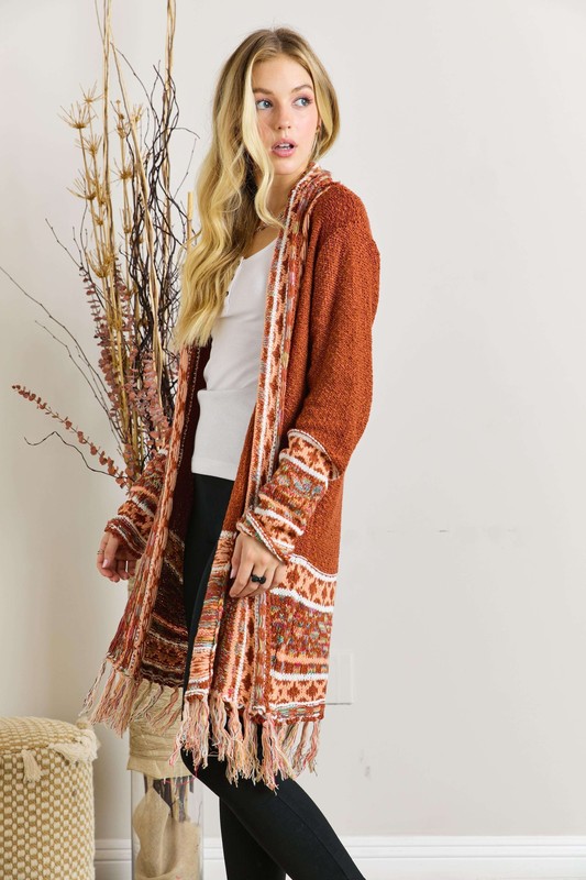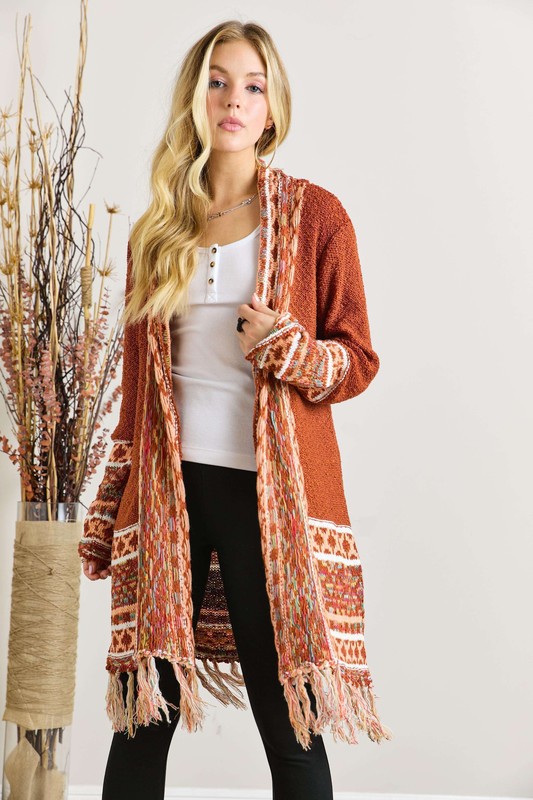 This Fringe Hem Aztec Border Cardigan features a unique Aztec border design with trendy fringe detailing along the hem. Perfect for adding a bohemian flair to your outfit, this cardigan is both stylish and eye-catching. The fringe hem adds a playful and fun touch, making it a statement piece for a fashionable and cozy look.
