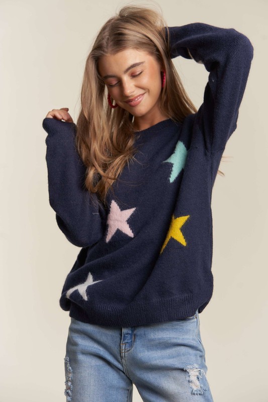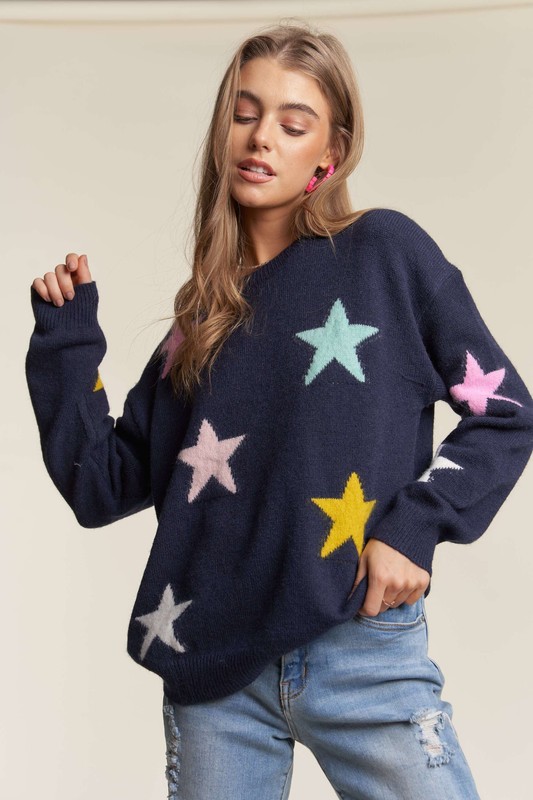 The Stars Pattern Round Neck Drop Shoulder Sweater combines comfort with style for a trendy look. Featuring a whimsical star pattern, this sweater adds a playful touch to your outfit. The drop shoulder design creates a relaxed and effortless silhouette, perfect for casual wear. Stay cozy and fashionable with this unique and eye-catching sweater.