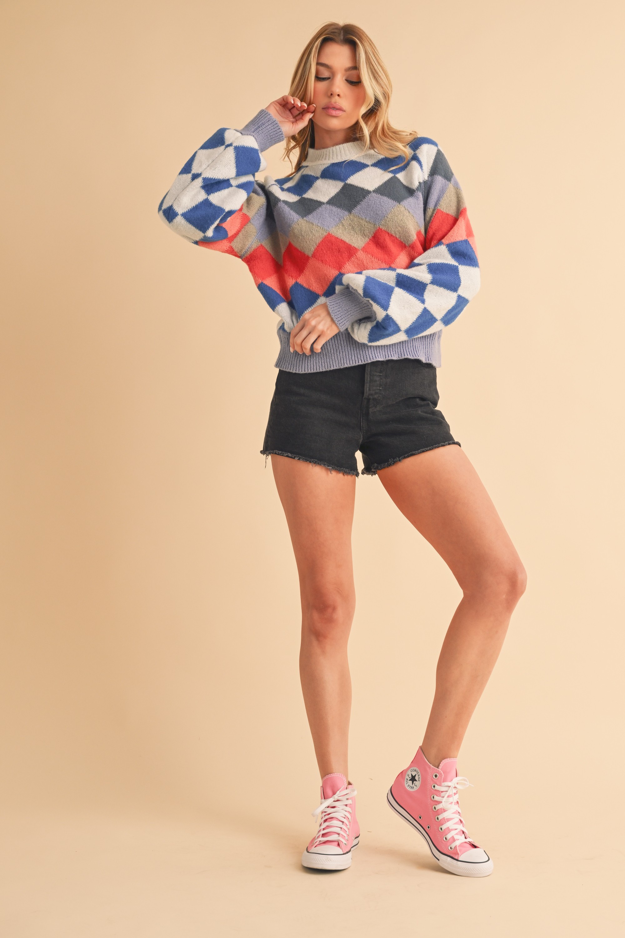 The Diamond Mock Neck Raglan Sleeve Sweater is a chic and stylish piece featuring a diamond pattern design, a mock neckline, and raglan sleeves. The mock neck adds a trendy and sophisticated touch, while the raglan sleeves provide a sporty and casual look to the sweater. The diamond pattern adds a fashionable and eye-catching detail to the overall design.