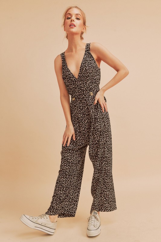 The Ditsy Floral Surplice Sleeveless Wide Leg Jumpsuit is a chic and summery one-piece outfit featuring a small, delicate floral print. The surplice neckline and sleeveless design add a touch of sophistication and allow for easy movement. The wide leg silhouette offers a flattering and stylish look, perfect for a variety of occasions from daytime outings to dressier events. This jumpsuit is a trendy and feminine choice for a fashion-forward wardrobe.