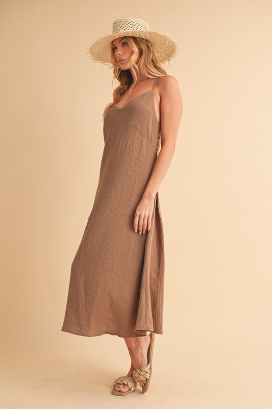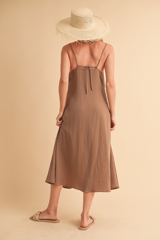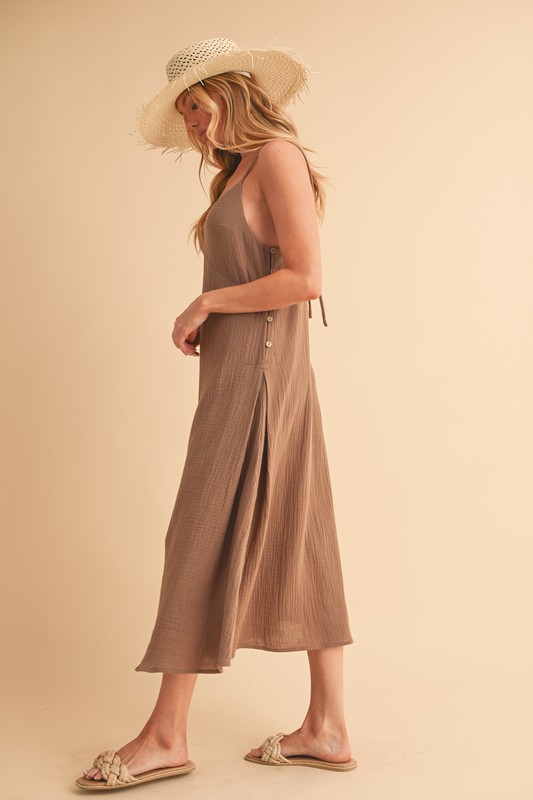 This midi cami dress is adorned with stylish side buttons for a unique and trendy touch. The sleek design offers a flattering silhouette that can be dressed up or down with ease. Elevate your wardrobe with this chic side button midi cami dress.
