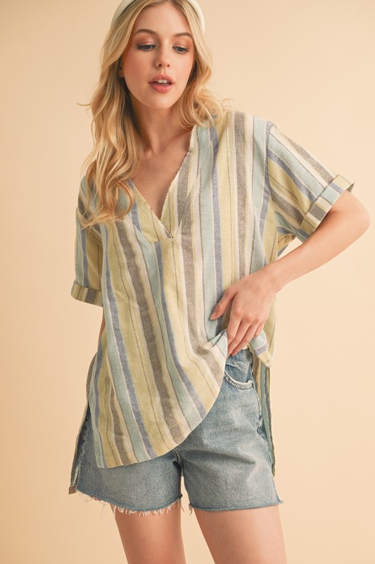The side slit striped short sleeve blouse is a chic and versatile piece for your wardrobe. The side slits add a touch of modernity and flair to the classic striped blouse. The short sleeves offer a breezy and comfortable fit for warmer days. This blouse is perfect for both casual and dressy occasions, providing a polished and sophisticated look. Pair it with tailored pants for a professional outfit, or with jeans for a more laid-back and effortless style.