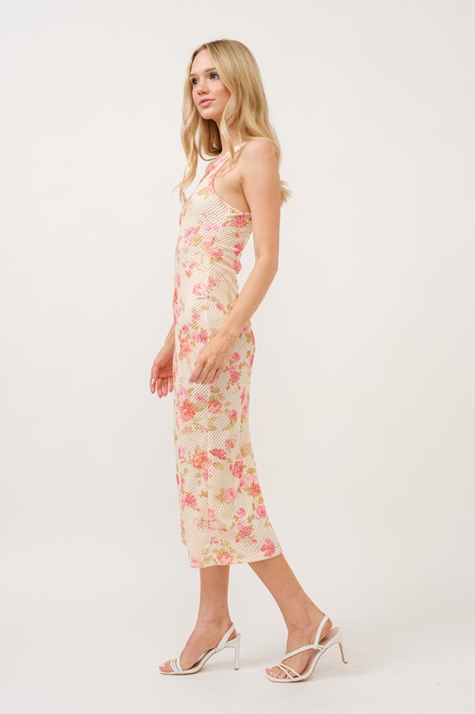 This floral fishnet bodycon midi dress is a daring and stylish choice for a night out or a special event. The intricate floral pattern combined with the edgy fishnet material creates a bold and eye-catching look. The bodycon silhouette hugs the curves for a flattering and sultry fit, while the midi length adds an element of sophistication. Perfect for making a statement and turning heads, this dress is sure to make you feel confident and glamorous.