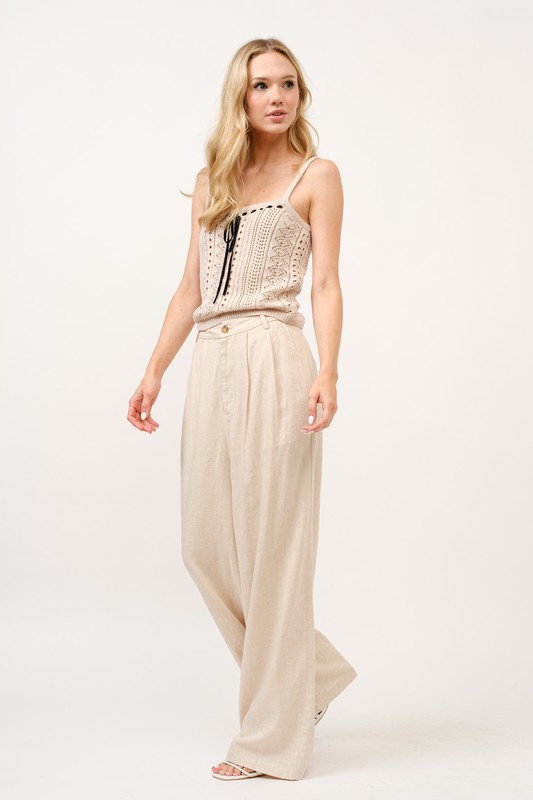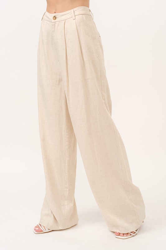 High-rise relaxed wide leg linen blend pants are a comfortable and stylish option for warm weather. The high-rise waist provides a flattering fit and elongates the legs, while the wide leg cut adds a relaxed and flowy silhouette. The linen blend fabric is breathable and lightweight, perfect for staying cool in hot temperatures. These pants offer a casual yet polished look that can be dressed up or down for various occasions. Pair them with a simple cami or a tucked-in blouse for a chic and effortless outfit. Overall, high-rise relaxed wide leg linen blend pants are a versatile and trendy piece for your summer wardrobe.