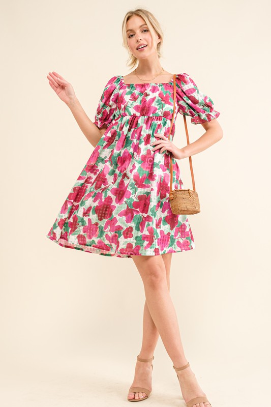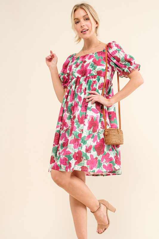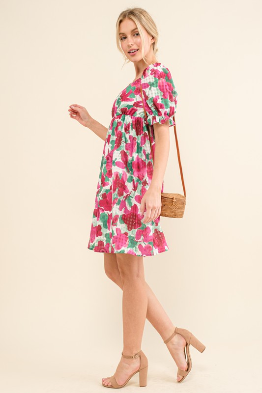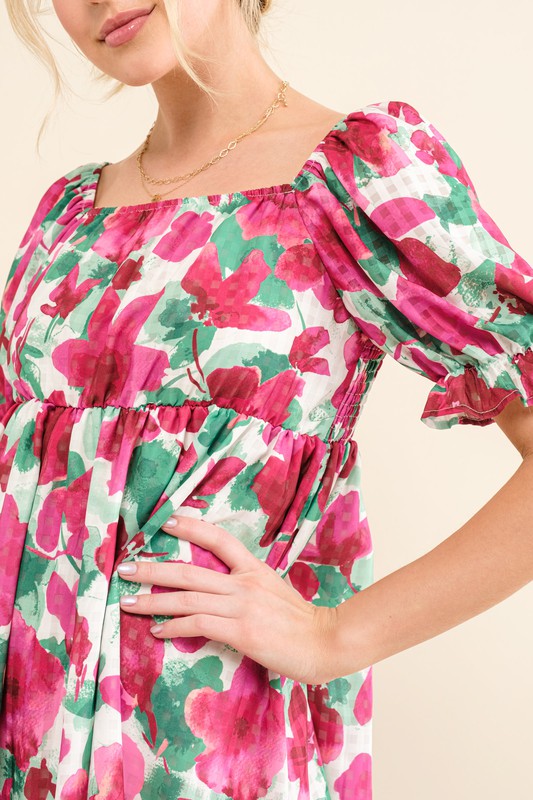 This smocked floral ruffle short sleeve mini dress is a delightful and feminine addition to your wardrobe. The smocked bodice provides a flattering and comfortable fit, while the floral print adds a touch of charm and whimsy. The ruffle detailing on the sleeves creates a sweet and romantic look, perfect for a casual day out or a summer gathering. Whether paired with sandals for a laid-back vibe or dressed up with heels for a more polished look, this mini dress is a versatile and trendy option for any outing.