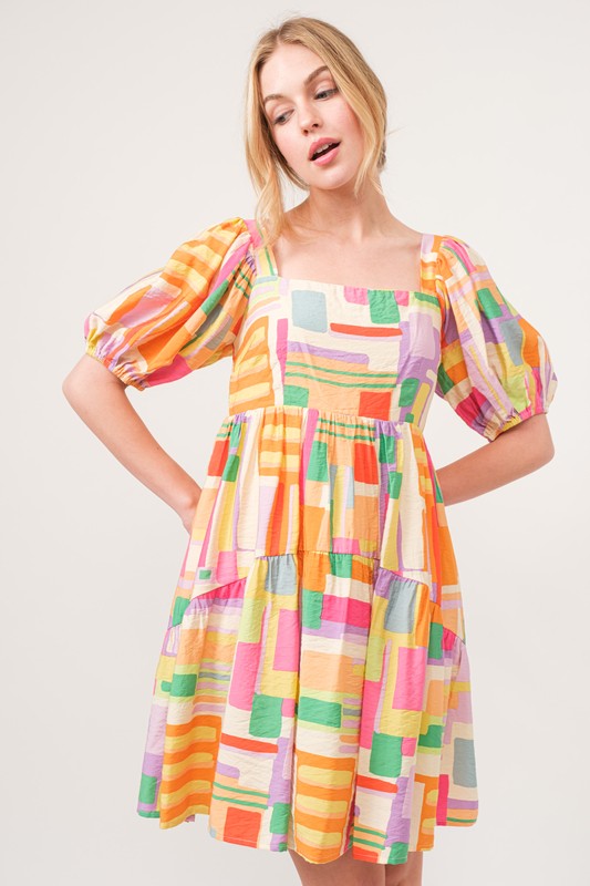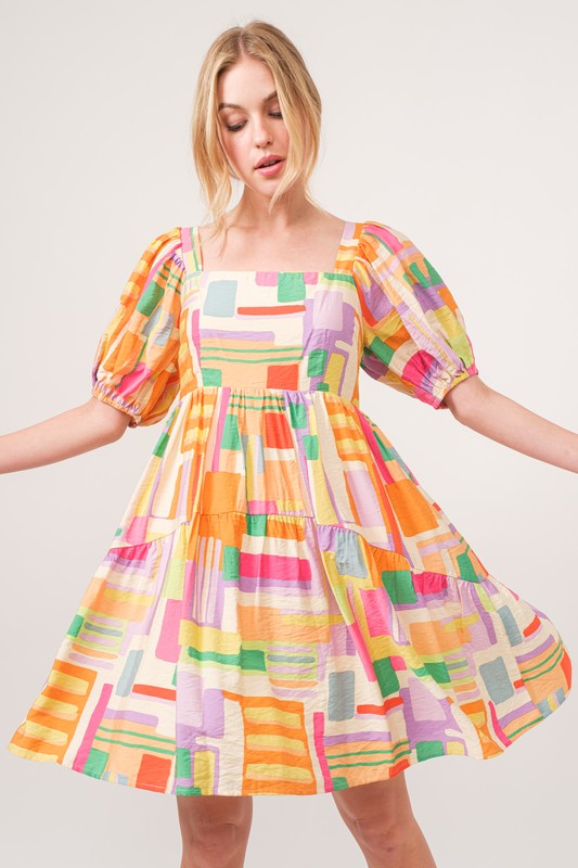 The square neck puff sleeve geo printed mini dress is a fashionable and eye-catching choice for a stylish ensemble. The square neckline adds a modern and chic touch, while the puff sleeves provide a trendy statement. The geo print design adds a bold and edgy look to the dress, perfect for making a statement. Pair this dress with heels or ankle boots for a versatile outfit that can go from day to night effortlessly. This dress is ideal for adding a touch of sophistication and flair to your wardrobe.
