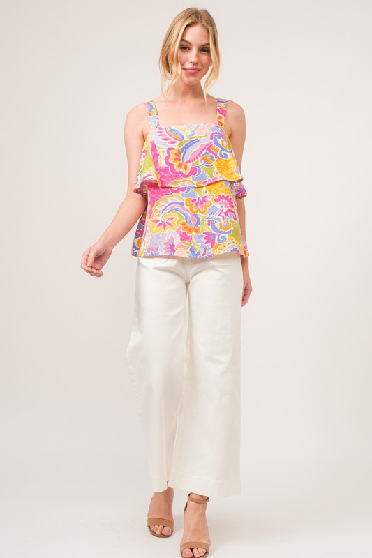 Square Neck Tiered Paisley Printed Top features a stylish square neckline. The top is designed with tiered layers for a unique and flattering silhouette. The paisley print adds a touch of bohemian flair to this versatile piece.