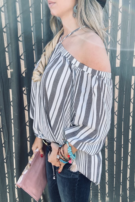 This top features a stylish stripe print design with cold shoulder cutouts and a halter neck silhouette, creating a trendy and flirty look. The cold shoulder detailing adds a modern touch, while the halter neck style highlights the shoulders and neckline. Pair this top with high-waisted jeans or shorts for a casual yet chic outfit that's perfect for summer days or nights out.