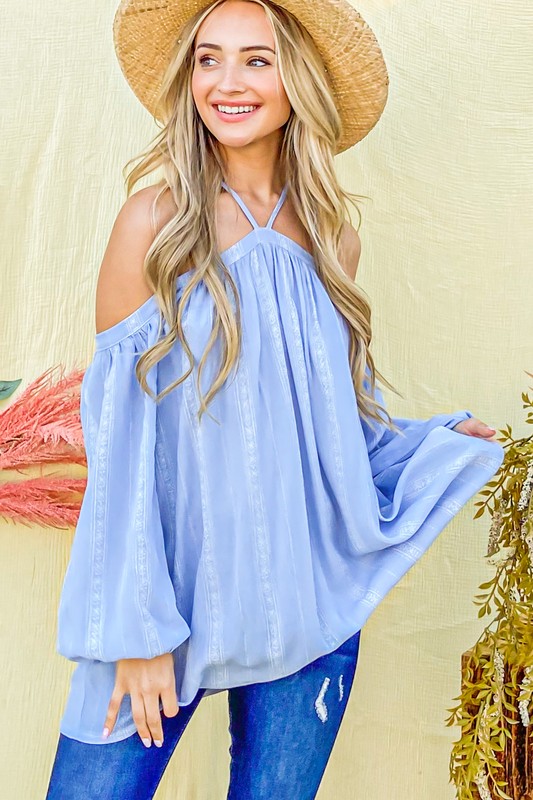 This top features a stylish stripe print design with cold shoulder cutouts and a halter neck silhouette, creating a trendy and flirty look. The cold shoulder detailing adds a modern touch, while the halter neck style highlights the shoulders and neckline. Pair this top with high-waisted jeans or shorts for a casual yet chic outfit that's perfect for summer days or nights out.