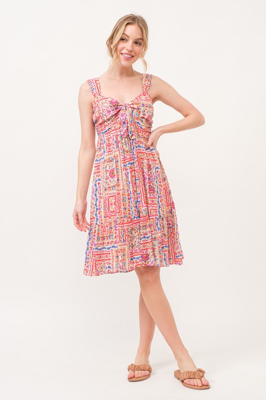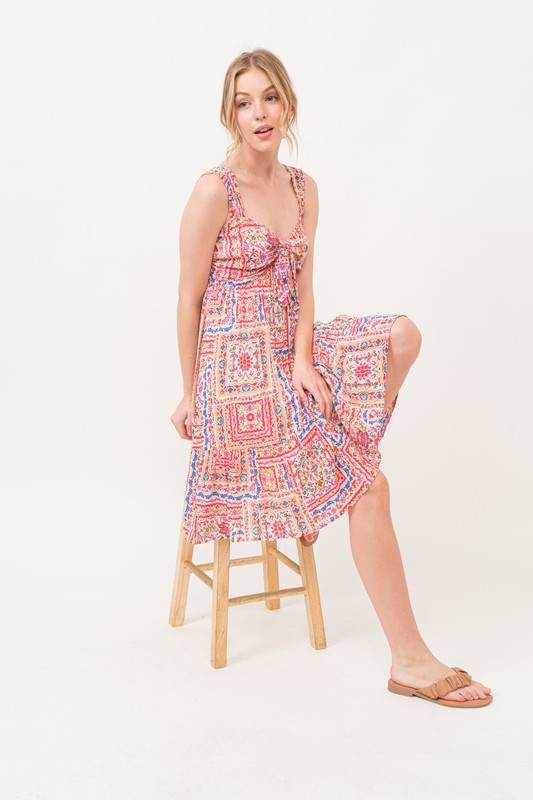 This boho printed dress features a tied front, smocked back, and tiered design for a laid-back and bohemian-inspired look. The tied front adds a stylish and adjustable detail, while the smocked back ensures a comfortable and flexible fit. The tiered skirt adds movement and visual interest, creating a breezy and carefree vibe. Perfect for a music festival, a beach day, or any casual outing, this dress offers a trendy and chic option for those who embrace bohemian style.
