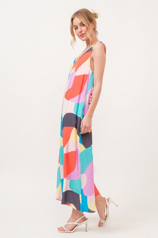 The Tied Shoulder Straps Wide-leg Geo Print Jumpsuit is a trendy and eye-catching ensemble for your wardrobe. Featuring tied shoulder straps and a wide-leg silhouette, this jumpsuit offers a stylish and comfortable fit. The geometric print adds a modern and playful touch to the overall design. Perfect for making a fashion statement, this jumpsuit is perfect for both casual outings and special occasions, providing a chic and effortless look.