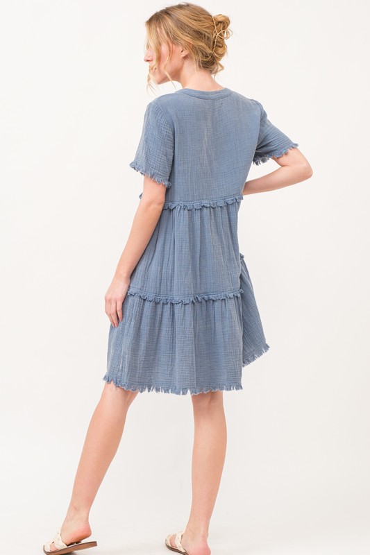 The washed frayed detail tiered dress is a relaxed and stylish choice for a casual yet trendy look. The washed fabric gives it a soft and comfortable feel, perfect for everyday wear. The frayed detailing adds a touch of edginess and texture to the dress, creating a cool and effortless vibe. The tiered design adds volume and movement to the silhouette, making it flattering and easy to style. Pair this dress with sneakers or sandals for a chic and laid-back outfit that can take you from day to night with ease.