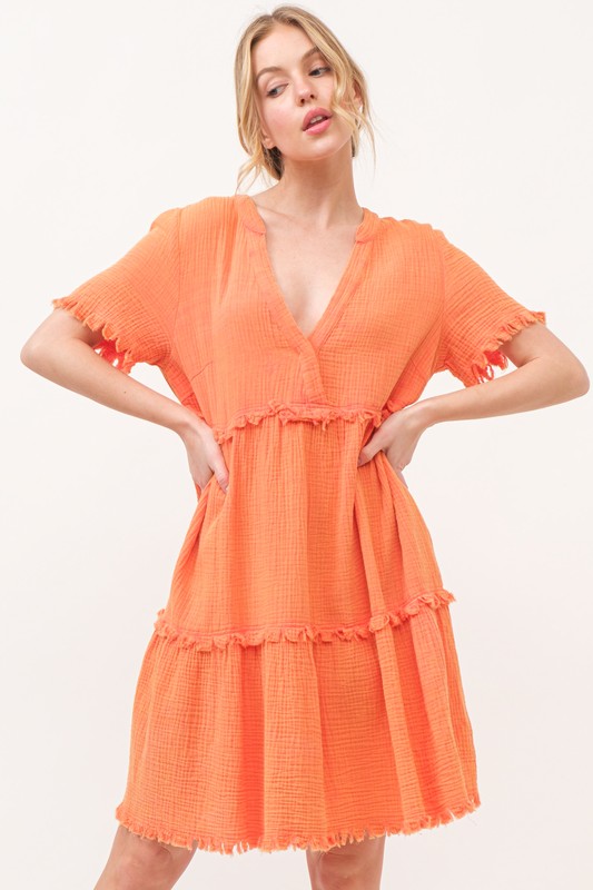The washed frayed detail tiered dress is a relaxed and stylish choice for a casual yet trendy look. The washed fabric gives it a soft and comfortable feel, perfect for everyday wear. The frayed detailing adds a touch of edginess and texture to the dress, creating a cool and effortless vibe. The tiered design adds volume and movement to the silhouette, making it flattering and easy to style. Pair this dress with sneakers or sandals for a chic and laid-back outfit that can take you from day to night with ease.