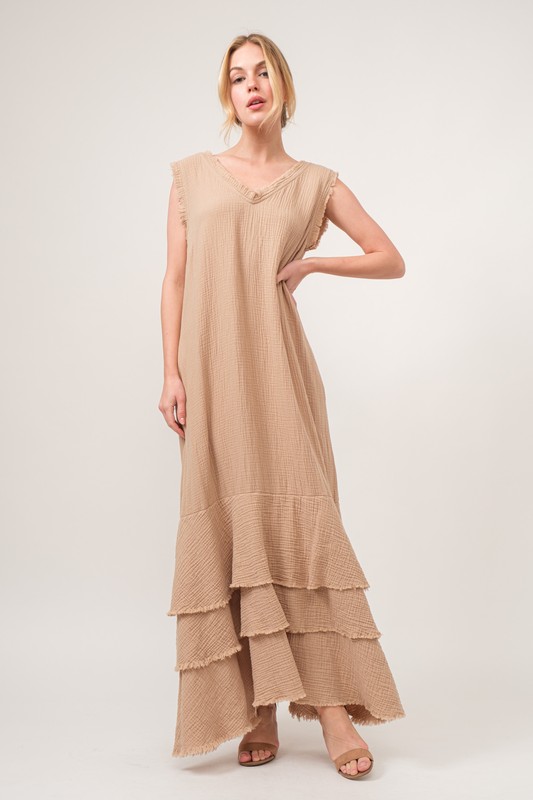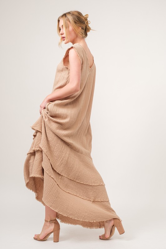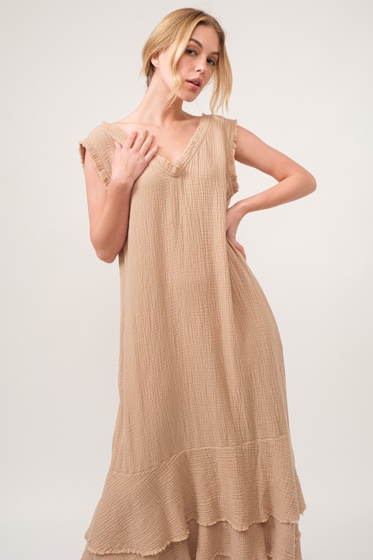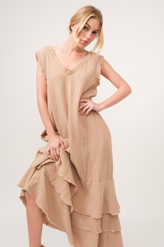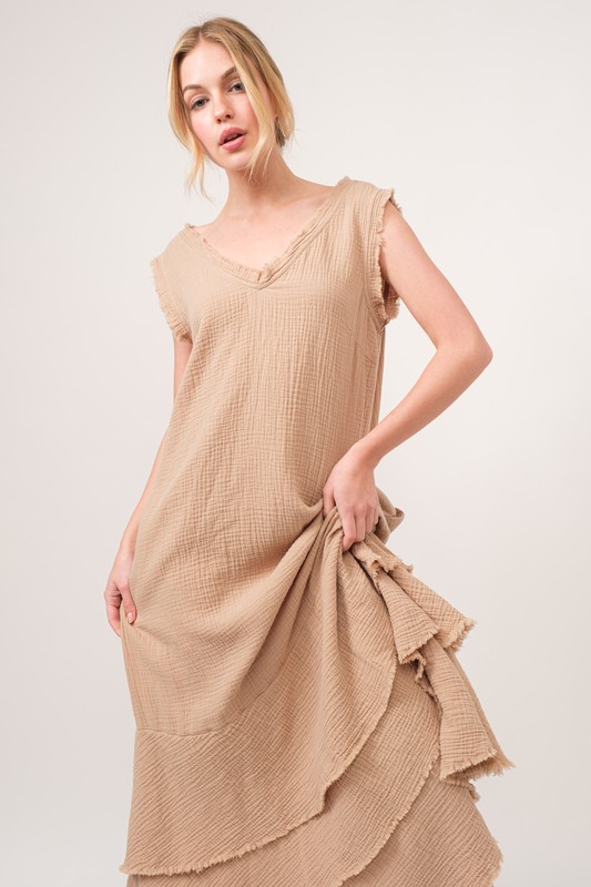 The washed cotton gauze fringe detail tiered dress is a bohemian-inspired and breezy option for a casual and relaxed look. The washed cotton gauze fabric gives it a soft and comfortable feel, perfect for warm weather. The fringe detailing adds a fun and playful element to the dress, creating movement and texture. The tiered design adds volume and flow to the silhouette, making it flattering and easy to wear. Pair this dress with flat sandals or espadrilles for a laid-back and effortless vibe that is perfect for a day out or a beach trip.