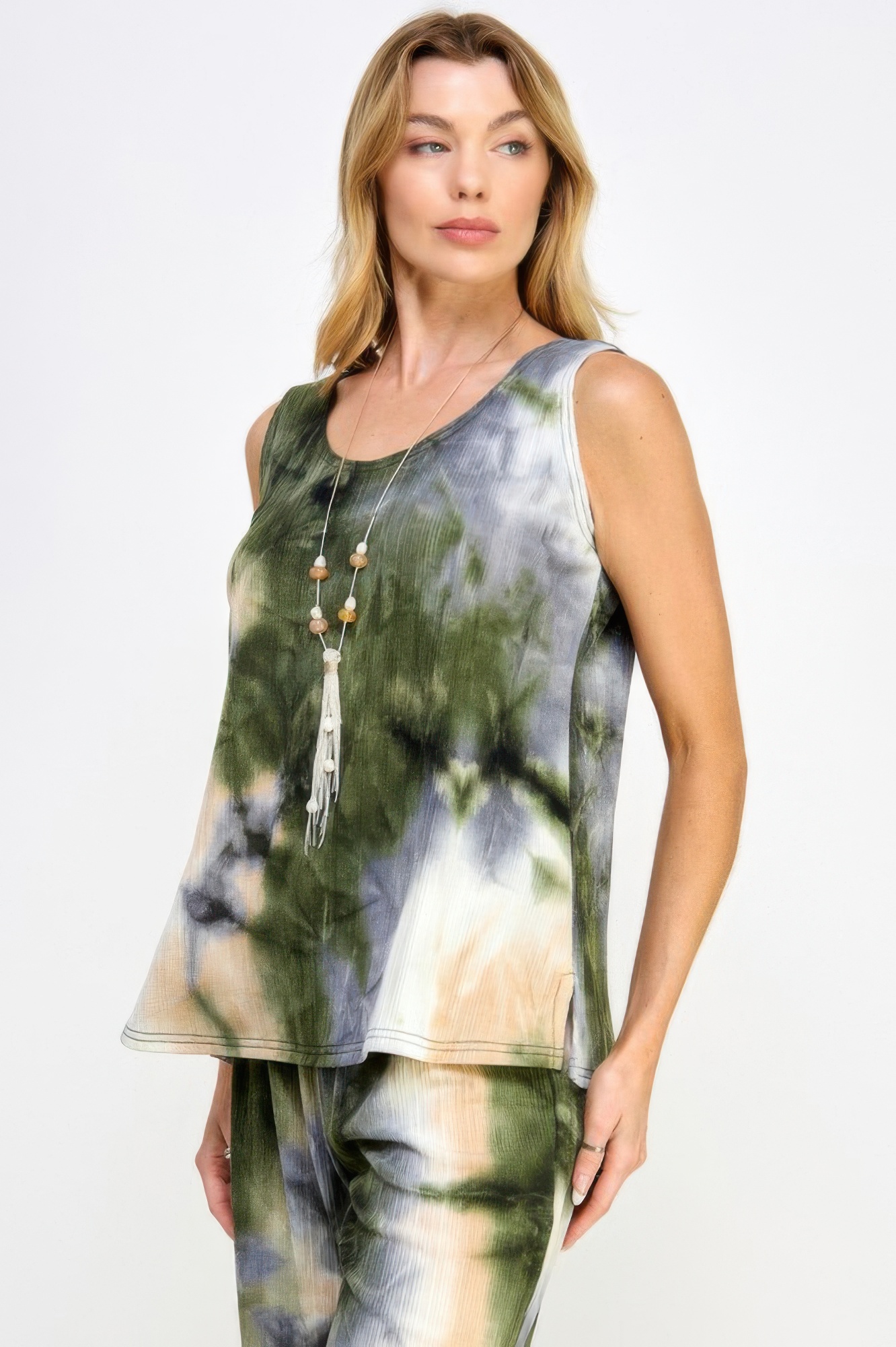 Express your style with the Andante Tie Dye Sleeveless Tank Top. This relaxed-fit piece features a soft, stretchy fabric and a bold tie-dye design that makes every outfit pop. Whether worn with jeans or layered under a jacket, it adds a splash of color and comfort to your everyday looks. Made in the USA, it's a vibrant and versatile essential.