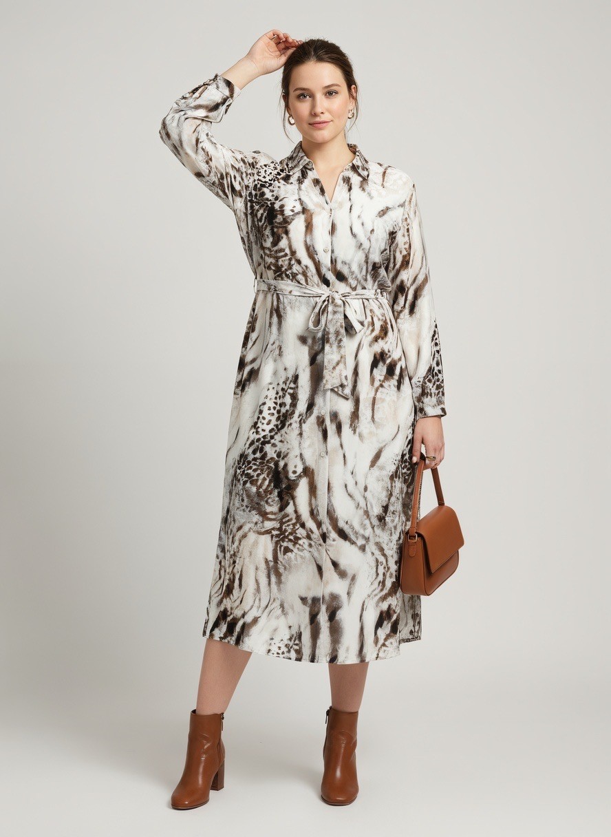 Make a confident statement with this animal print belted midi shirt dress, designed to blend bold style with effortless sophistication. Featuring a classic collar and full button-front closure, it offers a timeless structure with a modern edge. The self-tie belt cinches the waist to create a flattering, customizable silhouette. Its neutral beige and brown palette ensures easy styling from day to night. The striking animal print adds visual interest while maintaining a refined, polished feel. Perfect for workdays, dinners, or special outings, this dress delivers standout appeal with minimal effort.