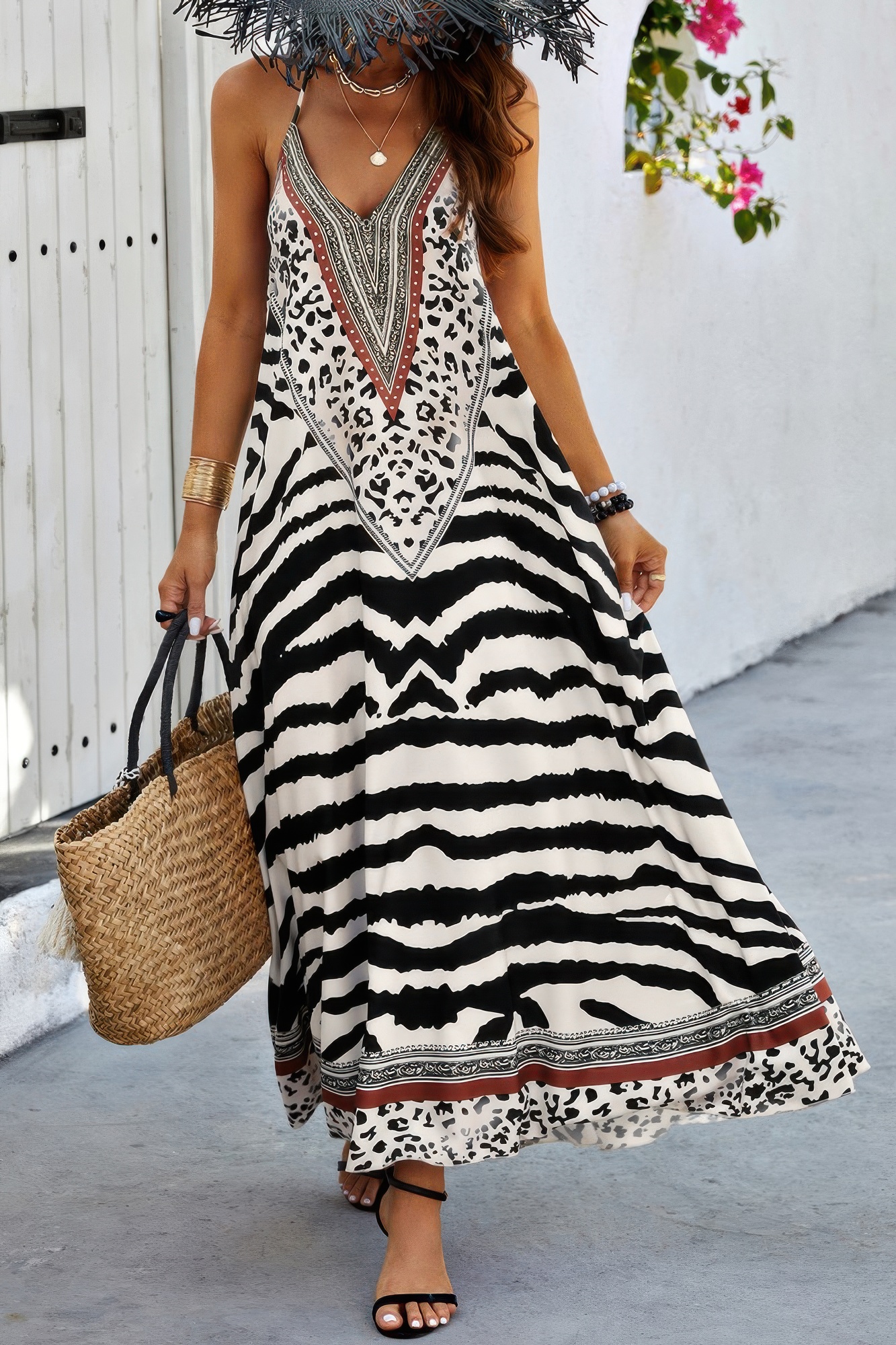 The Animal Print Halter Deep V Ruffle Maxi Dress is a striking piece that exudes confidence and effortless elegance. Crafted from a blend of 95% polyester and 5% elastane, this dress offers a comfortable stretch that moves beautifully with you. The halter neckline and deep V front add a sultry, flattering touch, while the ruffle details throughout the maxi silhouette create a soft, flowing shape. Perfect for sunny getaways or nights out, this dress effortlessly blends bold animal print with feminine ruffle charm.