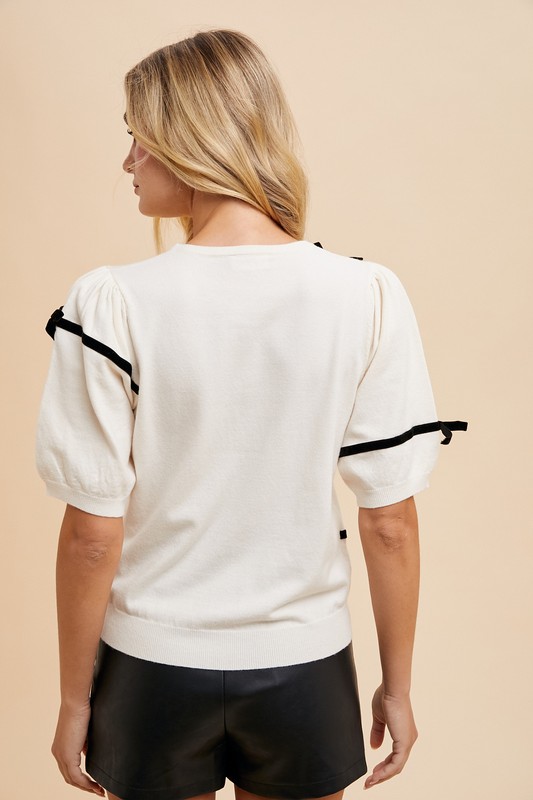 A striped bow round neck knit top is a charming and stylish piece that features a classic round neckline adorned with a feminine bow detail. The striped pattern adds a playful and timeless touch to the top, perfect for both casual and dressier occasions. The knit fabric provides comfort and texture, making it a versatile wardrobe essential that can be effortlessly styled with skirts, pants, or jeans for a chic and polished look.
