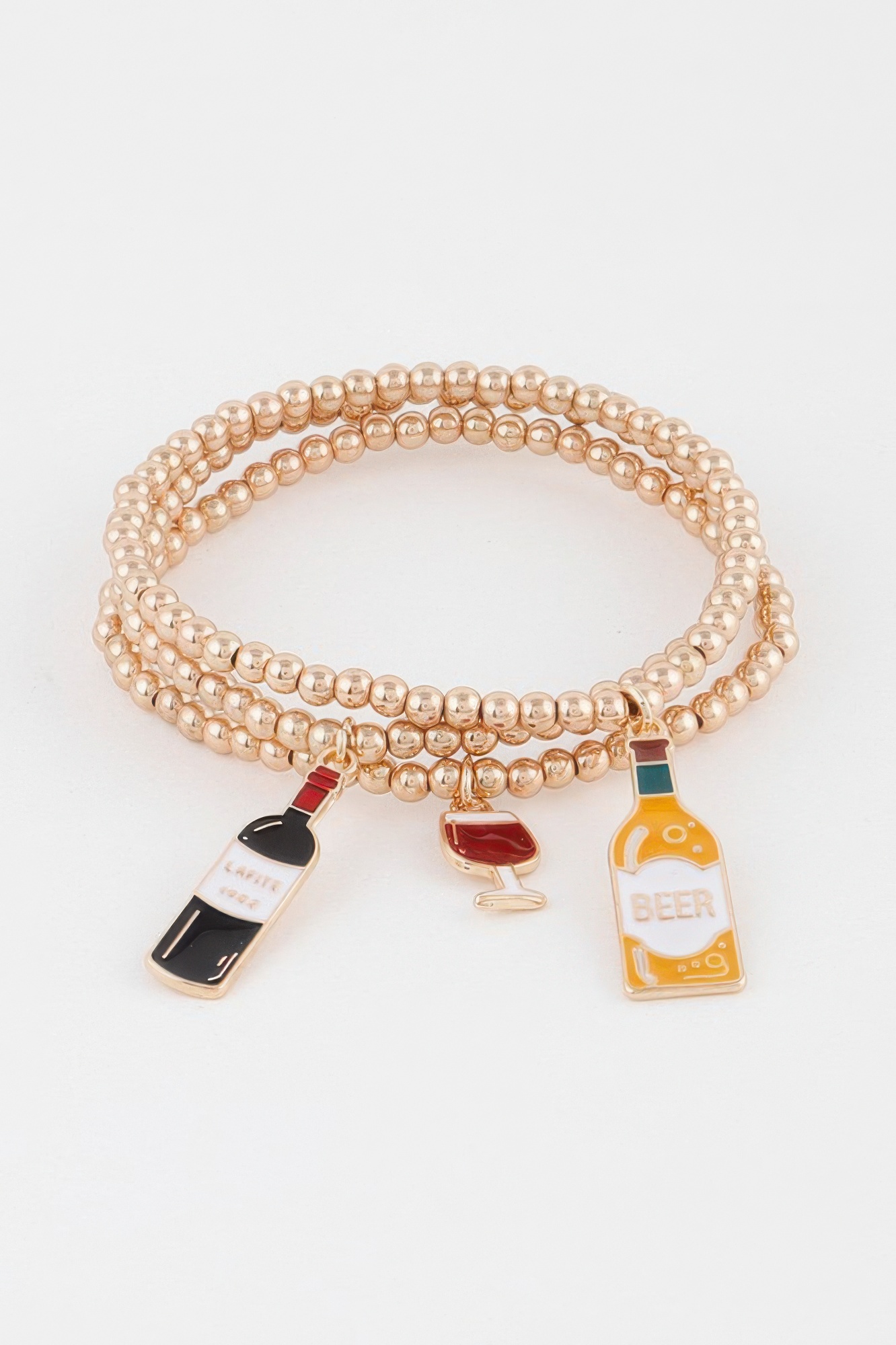 This beaded alcohol charm bracelet features a playful design accented with themed charms and polished beads. The detailed charms add personality, while the beaded structure creates a balanced and stylish look. Its stretch fit ensures easy wear and comfort throughout the day. Lightweight and versatile, it pairs well with both casual and layered styles. A fun accessory, it adds a unique touch to any outfit.