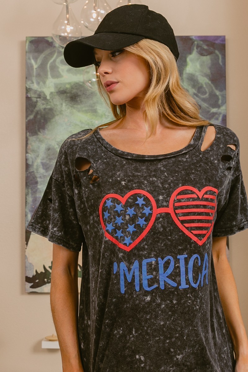 This mineral washed laser-cut top features a patriotic 4th of July theme, making it perfect for celebrating Independence Day in style. The laser-cut design adds a unique and edgy touch to the look. Made from high-quality mineral washed fabric, this top is both comfortable and fashionable. Stand out at your 4th of July festivities with this trendy and festive top!