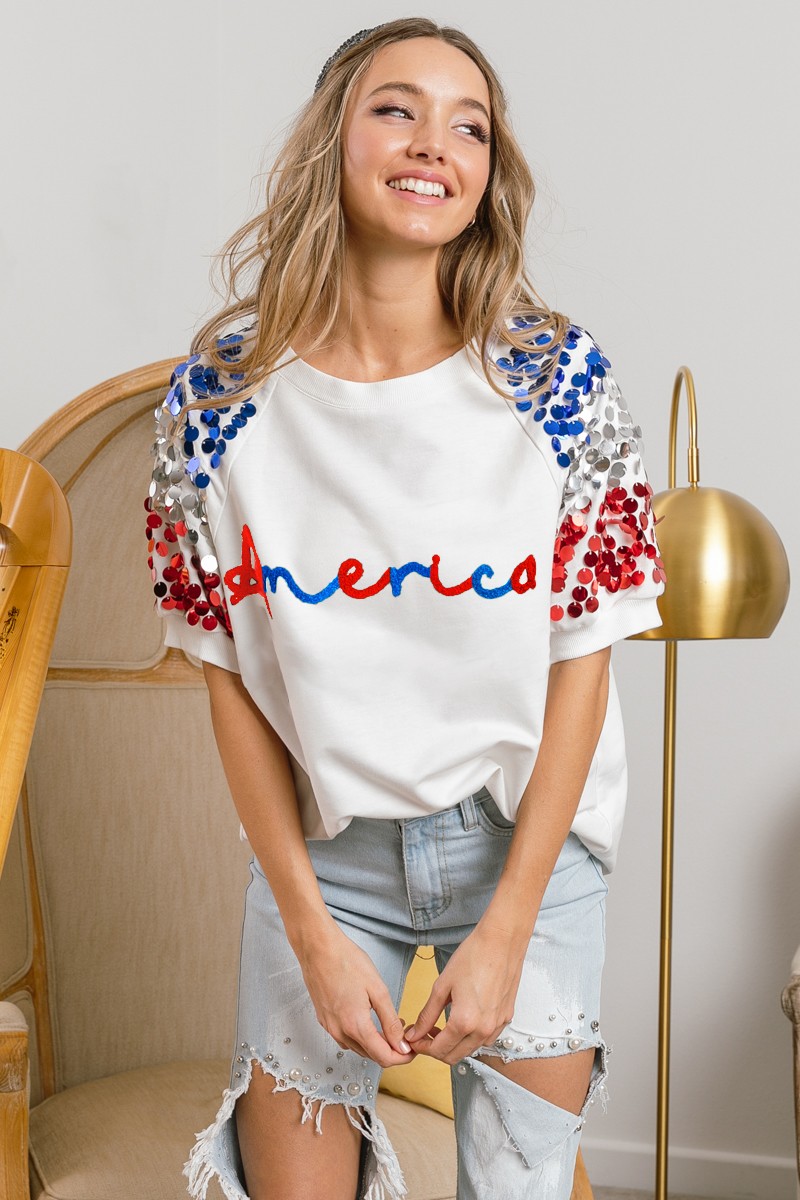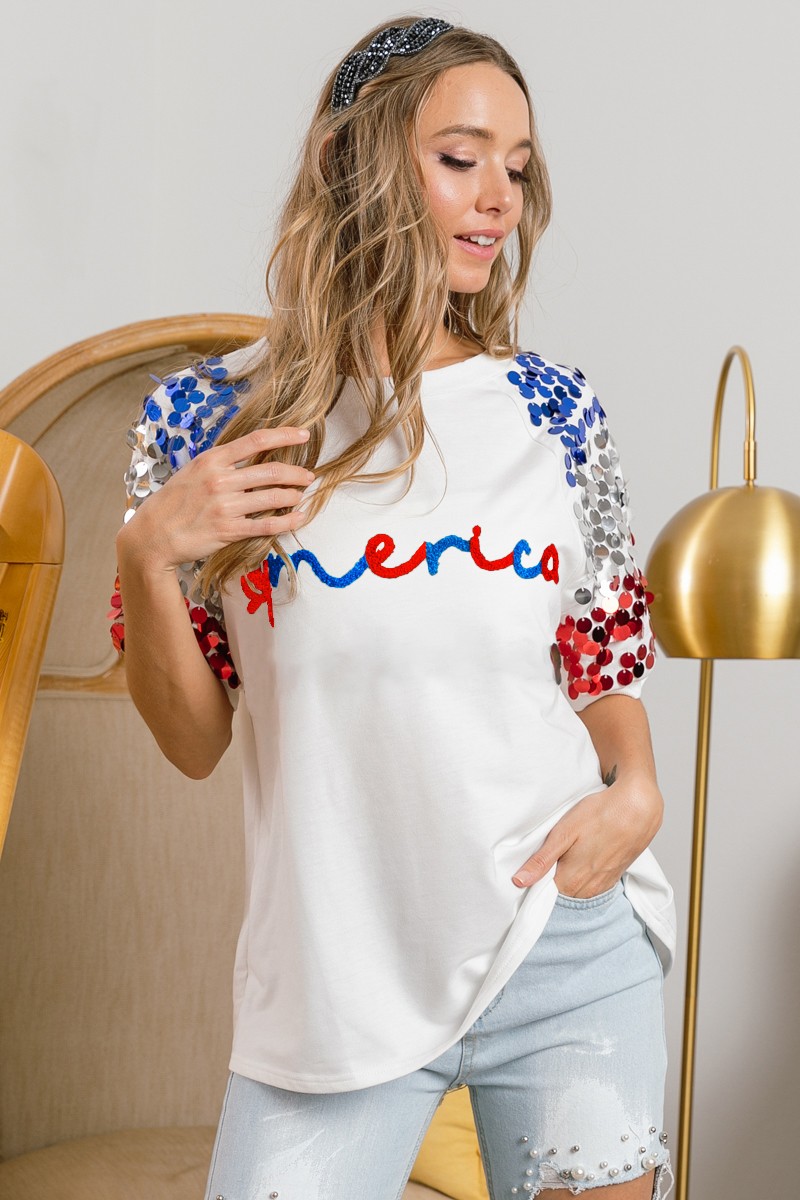Make a patriotic statement with this eye-catching "America" letter applique spangle puff sleeves top. The bold applique adds a fun and festive touch to this stylish piece. The puff sleeves bring a touch of femininity and charm to the top. Perfect for celebrating special occasions like Independence Day or showing off your American pride year-round. Pair it with jeans or shorts for a chic and trendy look that will make you stand out.