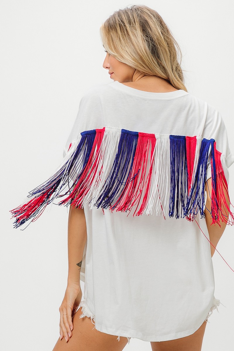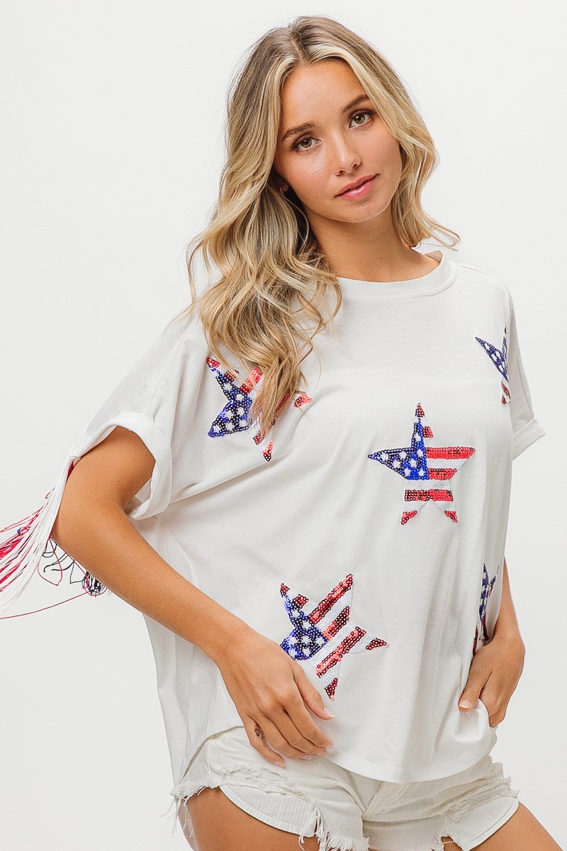 The American Flag Sequin Star Fringe Top is a patriotic and eye-catching piece perfect for celebrating special occasions like Independence Day. The top features sequin stars and fringe detailing that adds a fun and festive touch to any outfit. Pair it with denim or white bottoms for a stylish and spirited look.