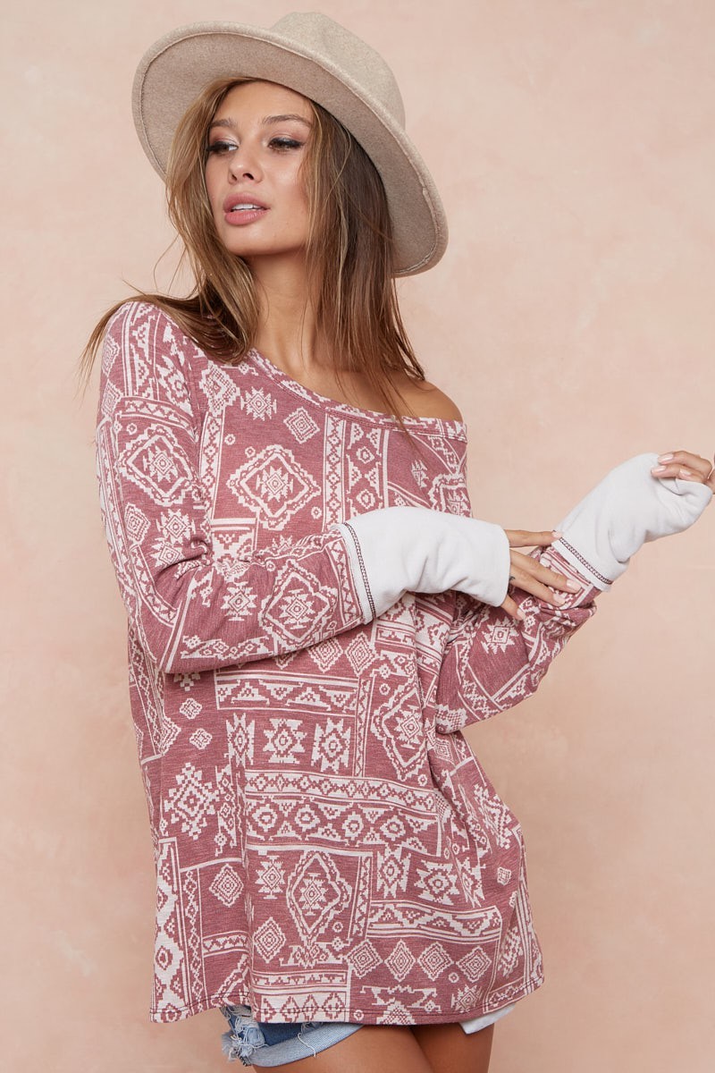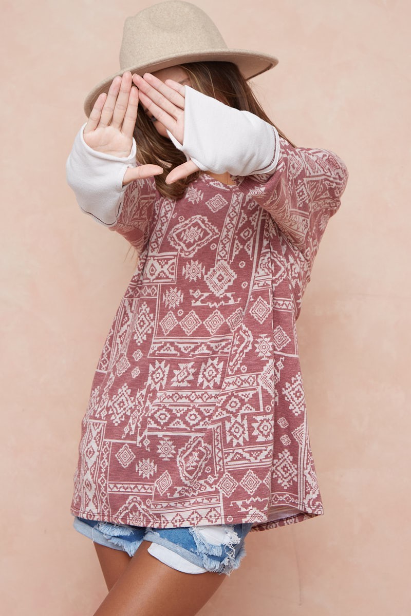 The Aztec print French terry top with thumb opening is a stylish and functional choice for your casual wardrobe. The Aztec print adds a vibrant and eye-catching touch to the cozy French terry fabric. The thumb openings provide a trendy and practical detail for added comfort. Perfect for adding a bohemian flair to your look, this top is versatile and easy to style. Elevate your outfit with this unique and comfortable top that combines fashion and functionality effortlessly.