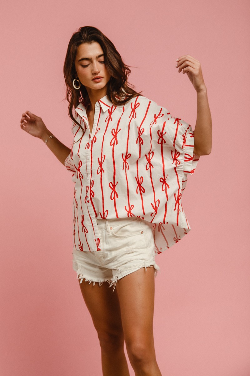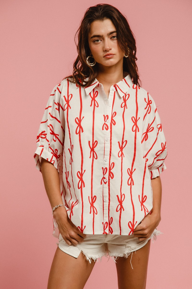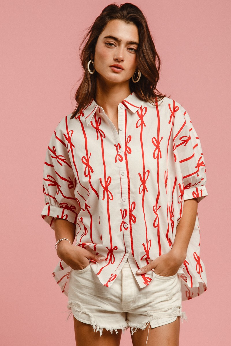 This Bow Ribbon Woven Printed Button Down Shirt Top is a stylish and versatile piece for your wardrobe. The woven fabric gives it a polished look, while the ribbon bow detail adds a feminine touch. It features a classic button-down design that can easily be dressed up or down for various occasions. Pair it with jeans for a casual look or with a skirt for a more dressed-up ensemble.