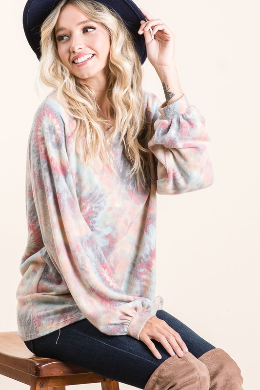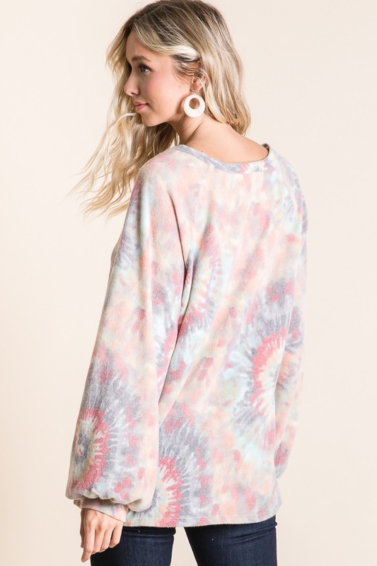 This casual tie-dye t-shirt features a beautiful blend of pastel colors including pink, blue, and grey in a contemporary tie-dye pattern. Made from a premium soft-touch fabric that ensures both comfort and style. The relaxed silhouette includes fashionable balloon sleeves with gathered cuffs, creating a feminine and modern look. The rounded neckline and loose fit make it perfect for everyday wear, while the unique tie-dye pattern adds a fashion twist to your casual wardrobe. Ideal for pairing with jeans, leggings, or shorts for a complete casual-chic outfit.