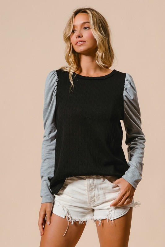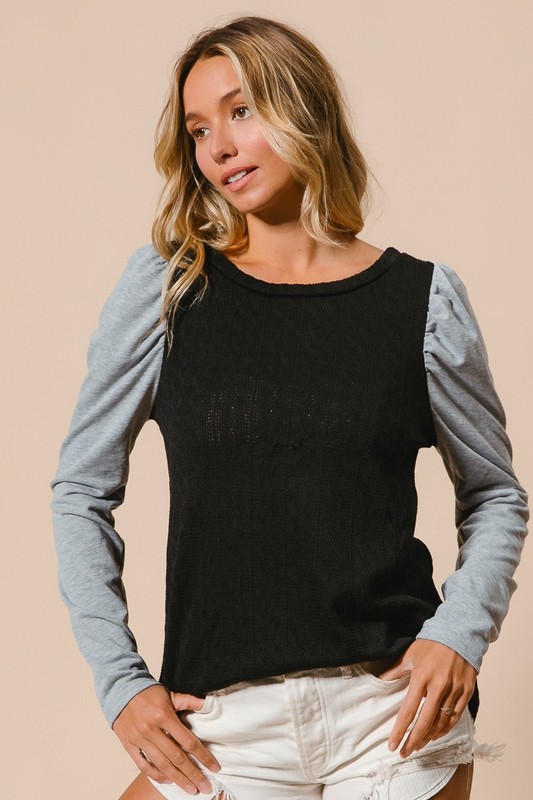The Cable Sweater Knit Top with Contrast Puff Sleeve is a stylish and unique piece that combines cozy cable knit texture with trendy puff sleeves. The cable knit detailing adds a classic touch and provides warmth and texture to the top. The contrast puff sleeves add a fashion-forward element, creating a statement look that is both chic and eye-catching. This top can be dressed up with tailored pants or a skirt for a sophisticated outfit, or paired with jeans for a more casual ensemble. The combination of cable knit texture and contrast puff sleeves makes this top a versatile and fashionable choice for adding a touch of flair to your wardrobe.