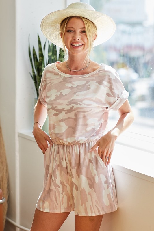 A camo print French terry romper with side pockets is a stylish and comfortable one-piece outfit that features a camouflage print on cozy French terry fabric with convenient side pockets. The camo print adds a trendy and edgy touch to the romper, giving it a modern and fashionable look. The French terry material offers comfort and softness, making it a practical choice for everyday wear. The addition of side pockets adds functionality and convenience, perfect for storing small essentials while on the go. This romper is versatile and can be styled with sneakers for a casual outing or dressed up with sandals for a chic look. Overall, a camo print French terry romper with side pockets is a trendy and practical choice for a stylish and effortless outfit.