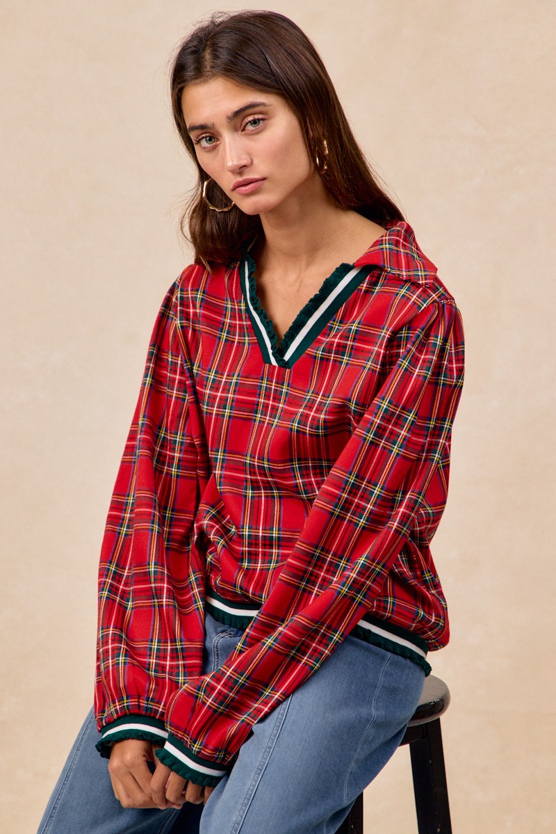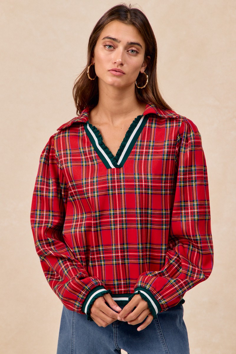 The Christmas Plaid Collared Top with Ruffled Detail is a delightful and festive choice for the holiday season. Featuring a classic plaid pattern, this top exudes a merry and traditional Christmas vibe. The addition of a chic collar and charming ruffled detail adds a touch of sophistication and playfulness to the design. Perfect for spreading holiday cheer and looking stylish at gatherings or celebrations. Dress up your winter wardrobe with this charming Christmas plaid top that captures the spirit of the season.