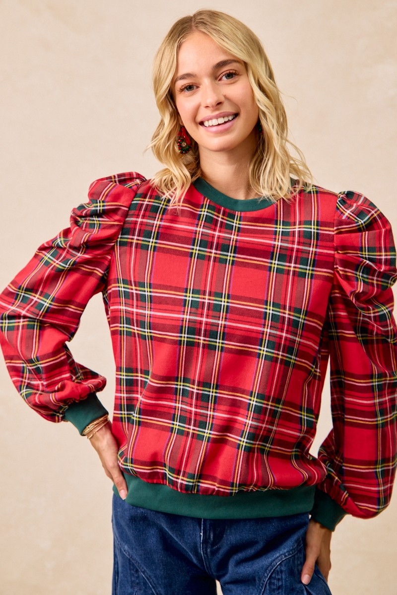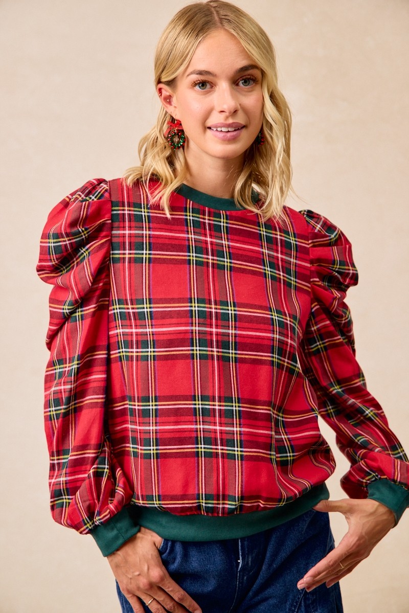 The Christmas Plaid Exaggerated Shoulder Sleeves Top features a festive plaid pattern and exaggerated shoulder sleeves for a bold and stylish look. Perfect for adding a touch of holiday spirit to your outfit. This top is a unique and eye-catching piece that is sure to make a statement. Elevate your festive wardrobe with this trendy and playful top that combines Christmas charm with fashion-forward design. Perfect for celebrating the holiday season in style.