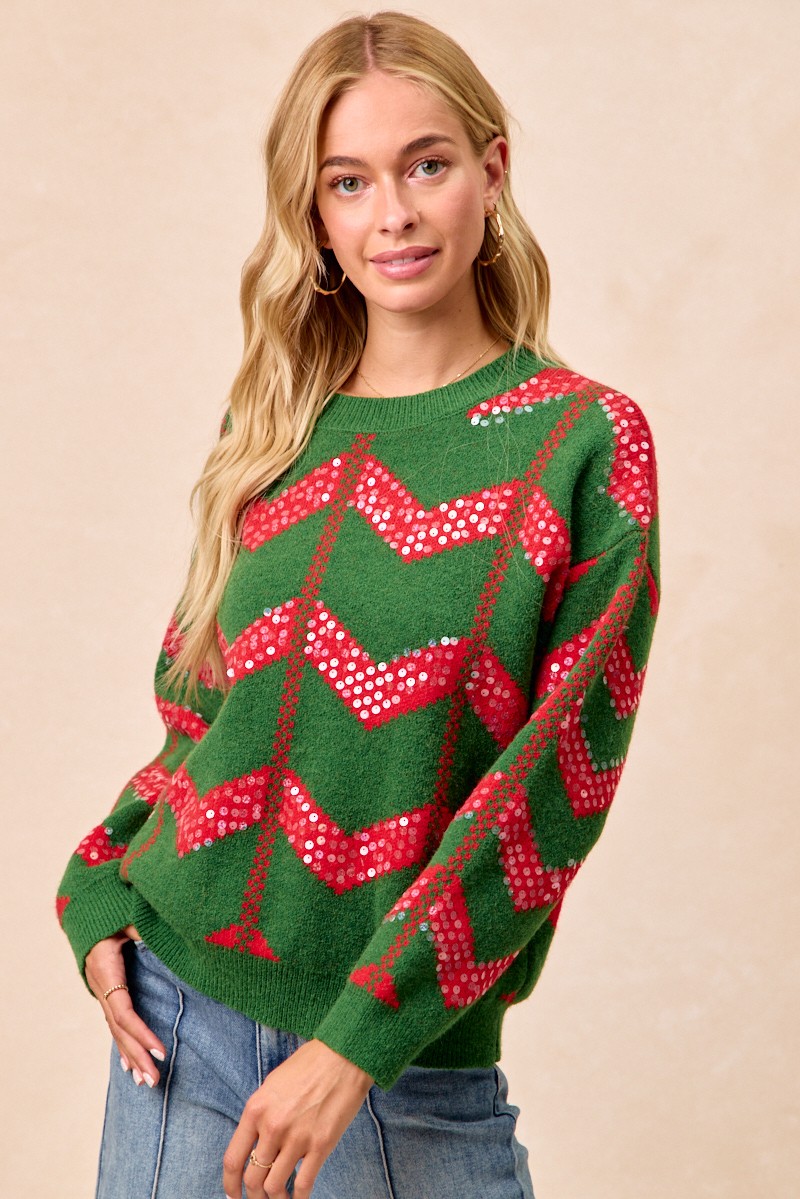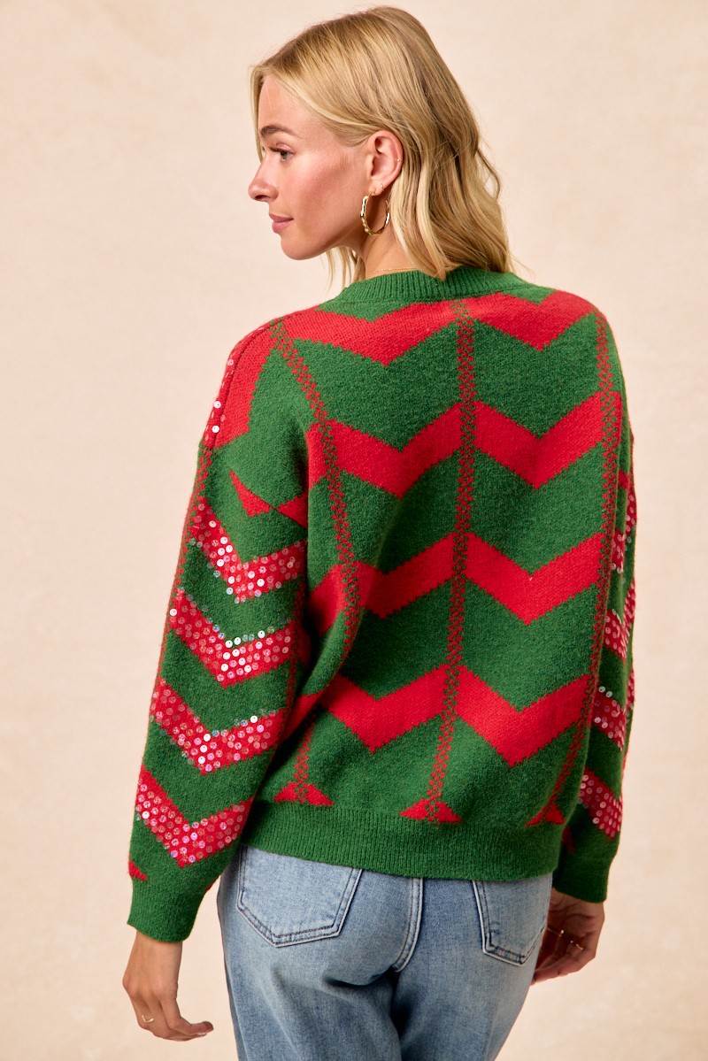 This Christmas-themed sweater with chevron sequins detailing is a sparkly and festive addition to your holiday wardrobe. The chevron sequins add a touch of glamour and fun to the design, perfect for celebrating the season in style. The sweater's Christmas theme brings a cheerful and festive vibe to your look, making it perfect for holiday parties and gatherings. With its eye-catching sequins and cozy knit fabric, this sweater is sure to stand out and keep you warm throughout the winter season. Get into the holiday spirit with this stylish and festive chevron sequins sweater that combines comfort and holiday flair.