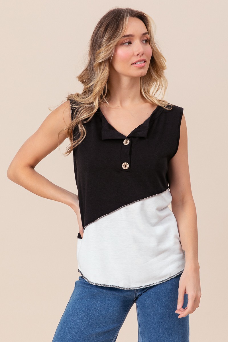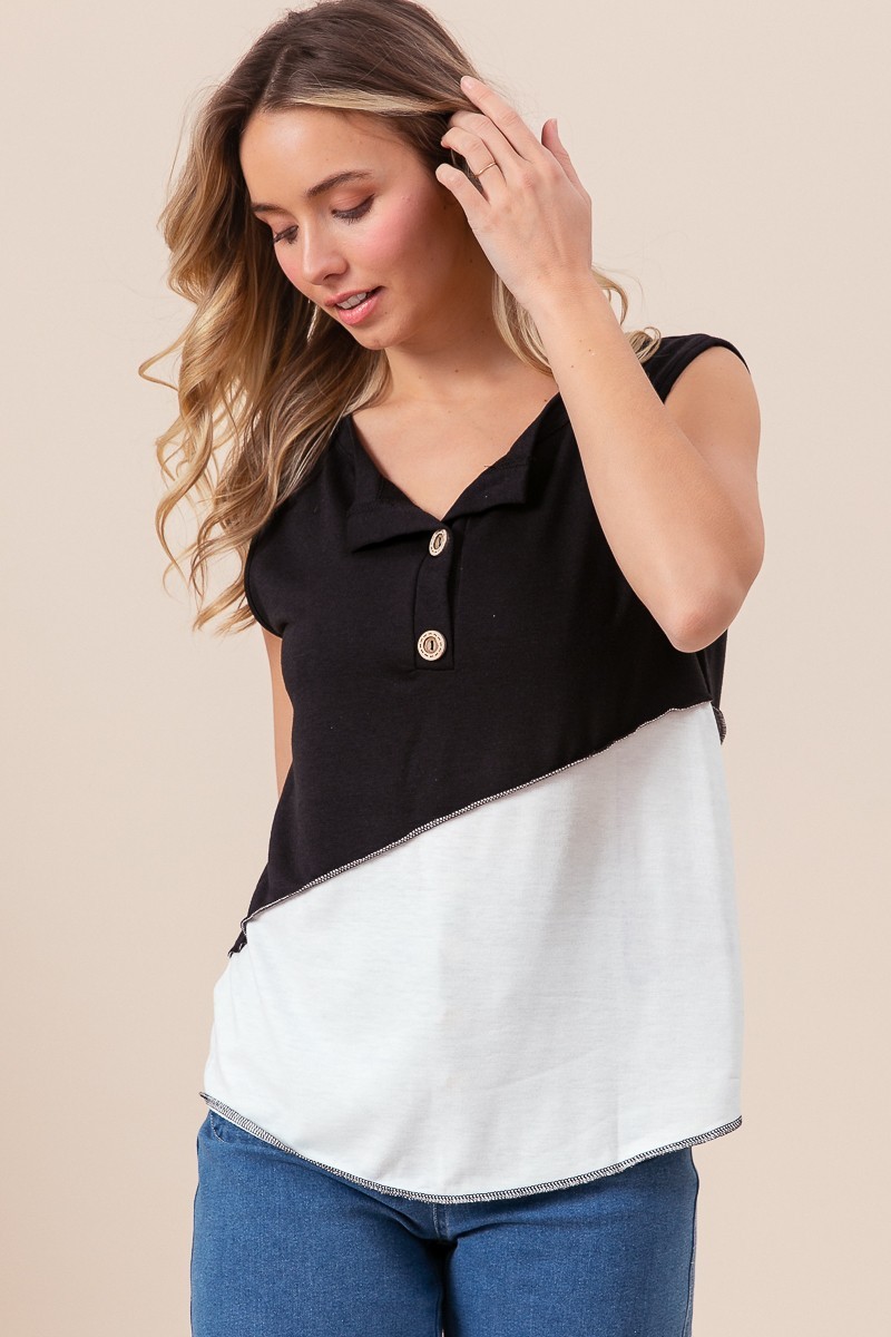 This Henley top features a stylish color block design with contrast stitching details that add a modern and trendy touch. The buttoned Henley neckline offers a classic and versatile look. Perfect for adding a pop of color and visual interest to your outfit, this top can be paired with jeans or leggings for a casual yet chic ensemble.