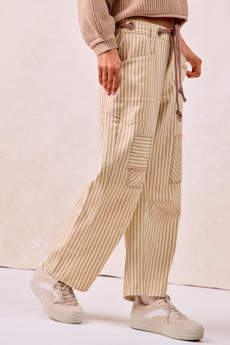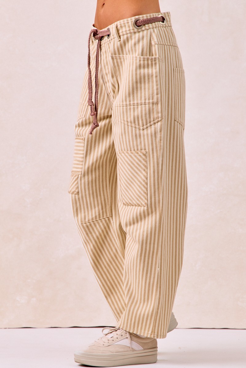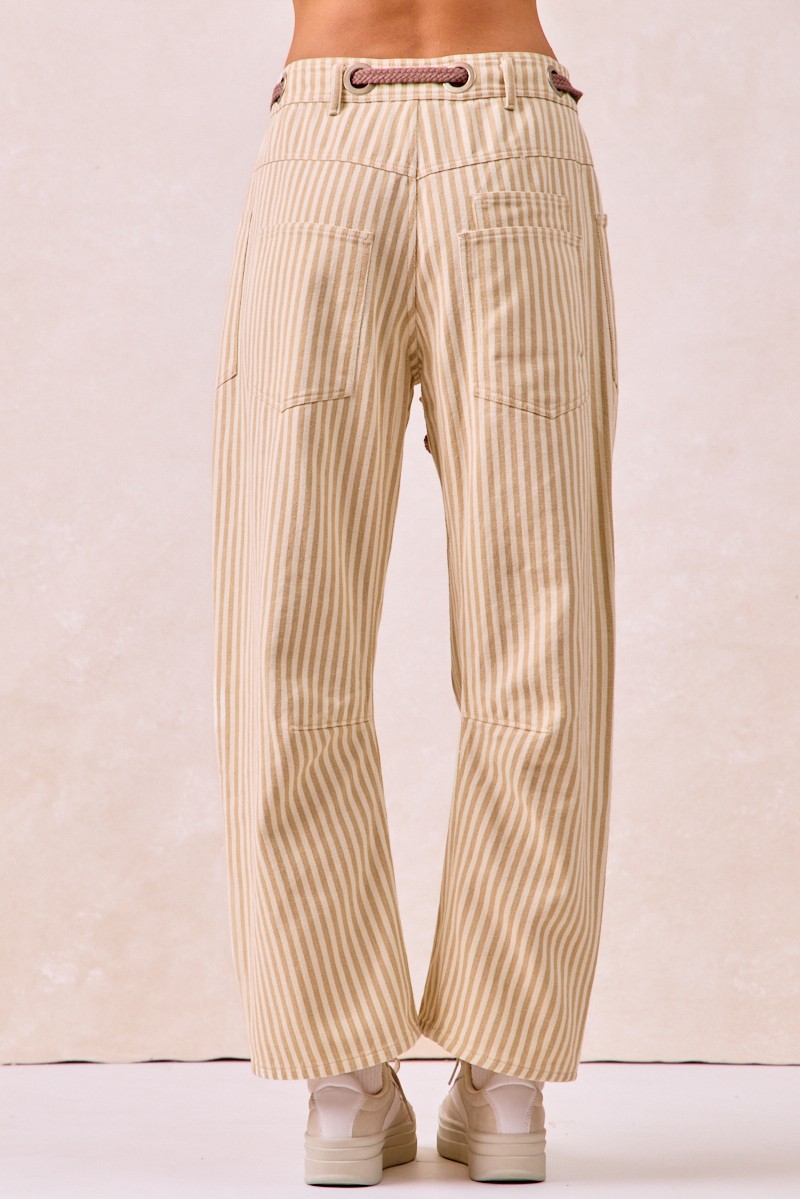 The Drawstring Striped Twill Barrel Pants are a fashionable and comfortable choice for a relaxed yet stylish look. Featuring a drawstring waist, these pants offer a customizable fit for all-day wear. The striped twill fabric adds a chic and trendy element to the design. With a barrel shape, these pants provide a modern and flattering silhouette. Perfect for casual outings or lounging at home, these pants combine fashion and comfort effortlessly. Elevate your everyday style with the versatile and on-trend Drawstring Striped Twill Barrel Pants for a laid-back and chic ensemble.