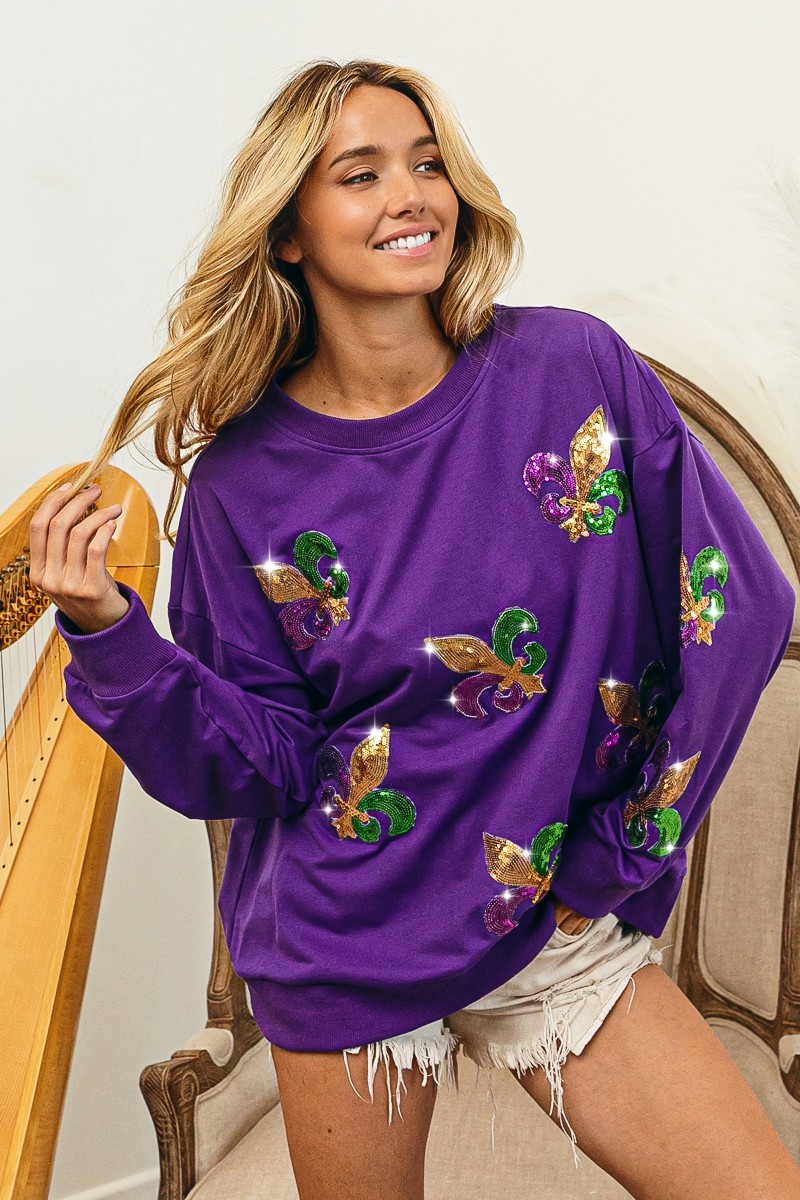 The Fleur De Lis Sequin Patches Mardi Gras Sweatshirt is a dazzling and unique piece perfect for celebrating the festive season. Featuring sparkling sequin patches in the shape of the iconic Fleur De Lis symbol, this sweatshirt is both stylish and fun. The comfort of the sweatshirt material ensures you can stay cozy while standing out in style. Pair it with jeans or leggings for a casual yet chic look at Mardi Gras events. Shine bright and show off your love for Mardi Gras with the Fleur De Lis Sequin Patches Mardi Gras Sweatshirt.