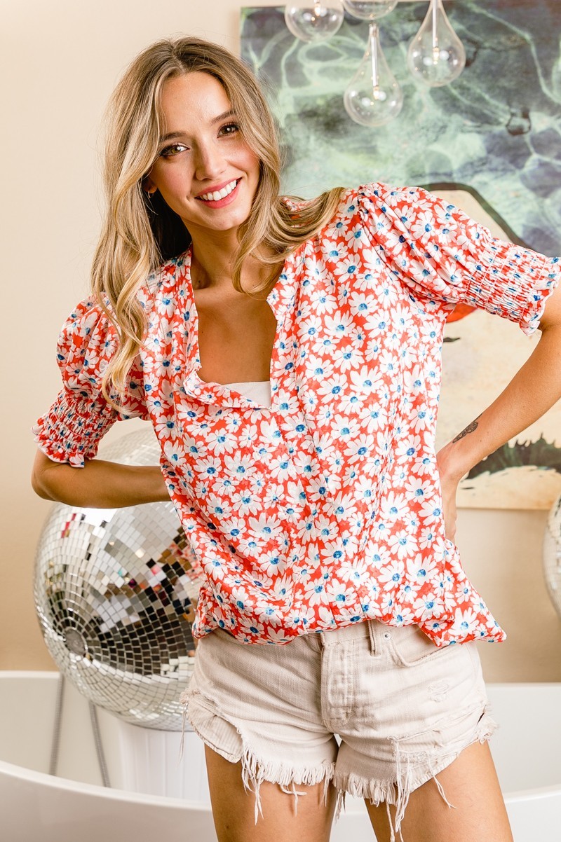 This top showcases a beautiful floral jacquard pattern with smocked detailing that adds texture and visual interest. The puff sleeves and V-neckline create a feminine and stylish silhouette. Perfect for any occasion, this top combines chic style with comfort, making it a versatile addition to your wardrobe.