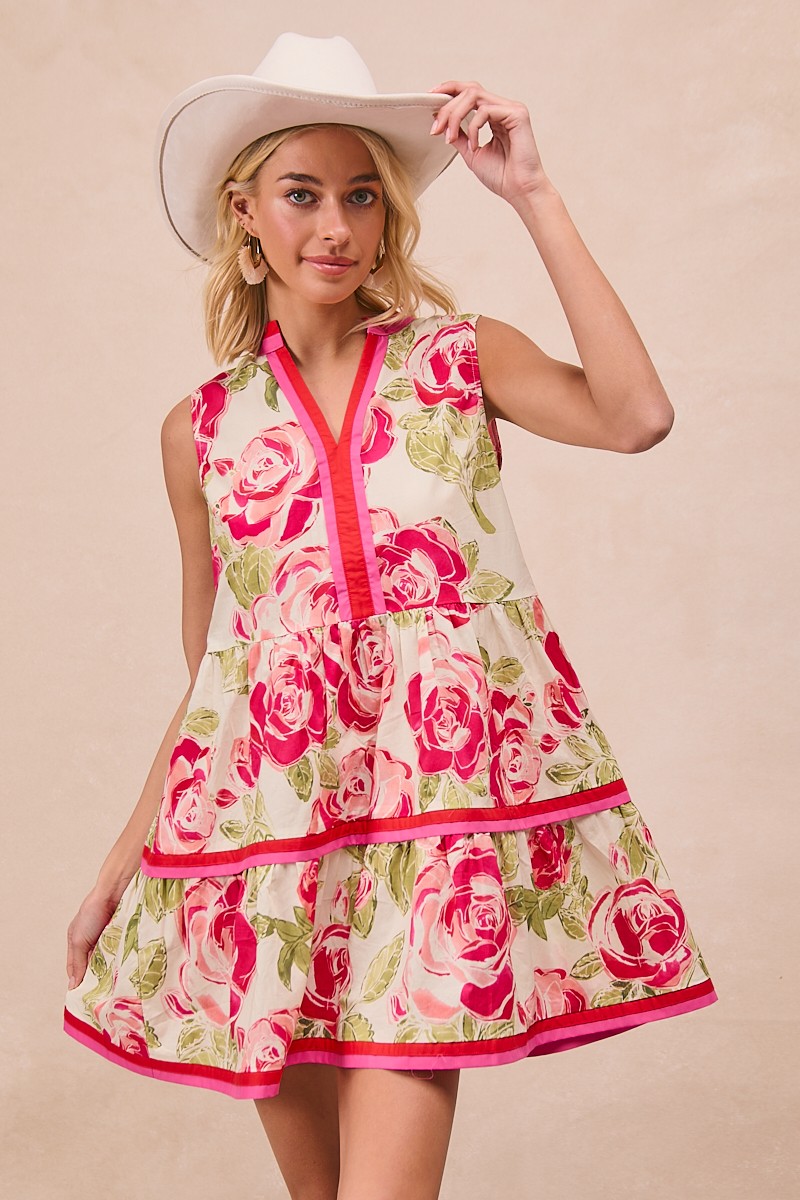 This charming floral print tiered ruffle mini dress is perfect for warm weather occasions. The lightweight fabric ensures a comfortable fit, while the tiered ruffle design adds a touch of playful elegance. The sleeveless design and v-neckline make it ideal for layering or wearing on its own. Made from a breathable cotton blend, this dress is both stylish and practical. The vibrant floral print and ruffle detailing make it a standout piece for any wardrobe. Perfect for casual outings, garden parties, or a day at the beach.