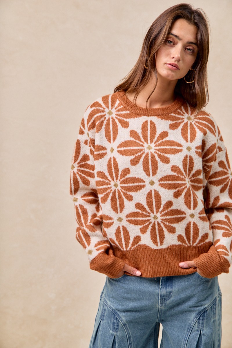 This stylish pullover sweater features a beautiful floral intarsia knit pattern in warm rust and cream tones. Made from soft acrylic blend yarn, it offers exceptional comfort and durability. The classic V-neckline adds sophistication while the relaxed fit provides all-day comfort. Perfect for casual outings, coffee dates, or cozy indoor wear. The ribbed hem and cuffs ensure shape retention, while the eye-catching botanical design makes it a standout piece for fall and winter wardrobes.