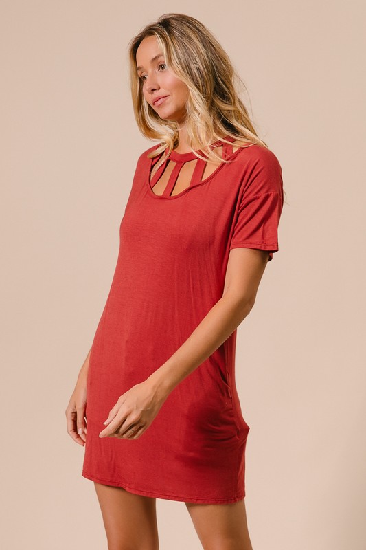 The front cutout mini tee dress with pockets is a trendy and versatile piece for your wardrobe. The front cutout detail adds a hint of edge and modernity to the classic tee dress style. The mini length gives a playful and casual vibe, perfect for everyday wear. The pockets offer functionality and convenience. This dress can be dressed up with heels and statement jewelry for a chic look, or dressed down with sneakers for a laid-back and comfortable outfit.