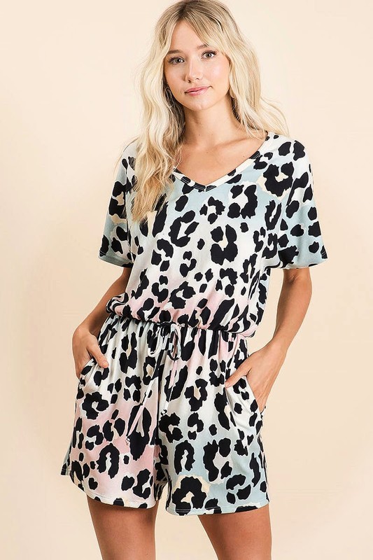 A gradation leopard soft knit V-neck romper is a stylish and comfortable one-piece outfit that features a blend of leopard print in a soft knit fabric with a flattering V-neckline. The gradation effect adds a unique twist to the classic leopard print, creating a fashionable and eye-catching look. The soft knit material offers comfort and ease of wear, making it a practical choice for a romper. The V-neck design enhances the neckline and adds a touch of sophistication to the outfit. This romper is versatile and can be styled with sneakers for a casual day out or dressed up with heels for a night out. Overall, a gradation leopard soft knit V-neck romper is a trendy and chic option that combines style and comfort for a fashionable ensemble.