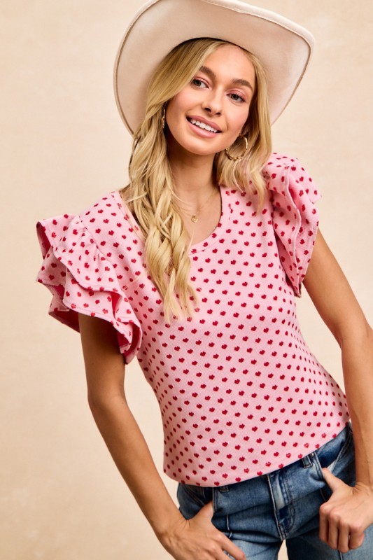 This heart-patterned knit top with ruffled sleeves is a charming and playful addition to your wardrobe. The heart pattern adds a sweet touch to the top, perfect for expressing your romantic side. The knit fabric is cozy and comfortable, making it ideal for all-day wear. The ruffled sleeves add a feminine and elegant detail, elevating the overall look of the top. Embrace the love theme with this delightful and stylish piece that is sure to make a statement!