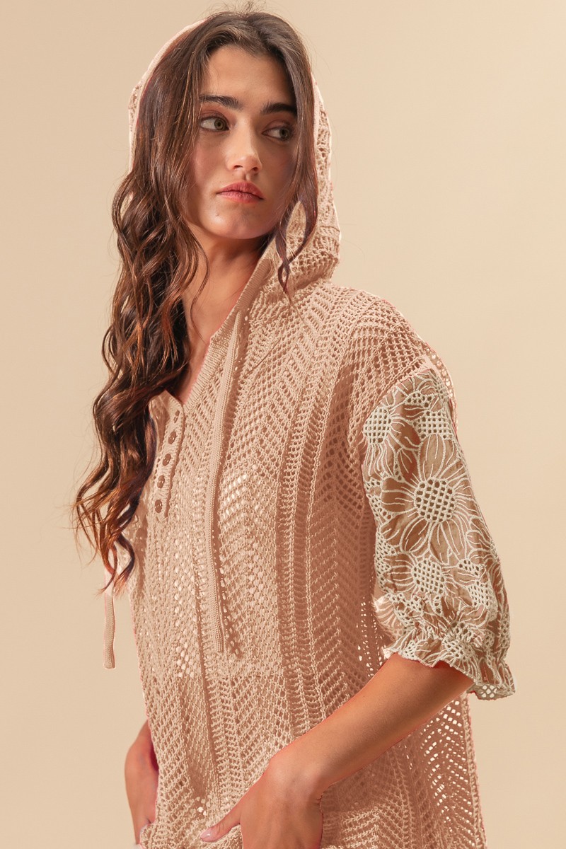 This jacquard flower puff sleeve hooded knit top combines intricate floral patterns with a touch of volume in the sleeves for a stylish look. The hooded design adds a cozy and casual element to the knit top. Perfect for adding a unique and feminine touch to your outfit, this top is a standout piece. Elevate your knitwear collection with this fashionable and on-trend top.