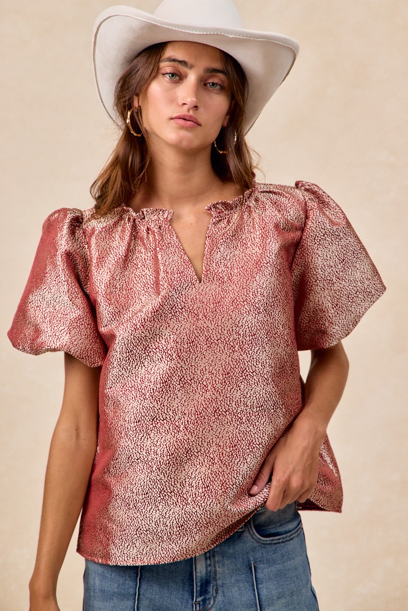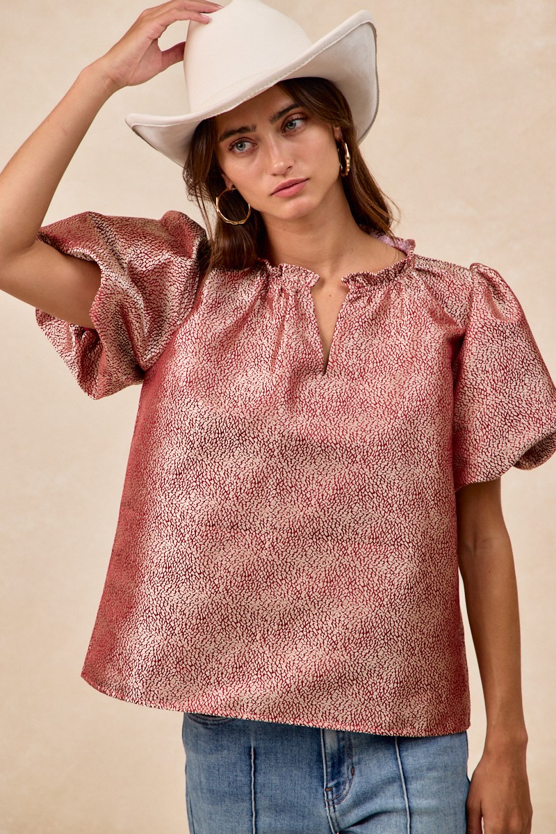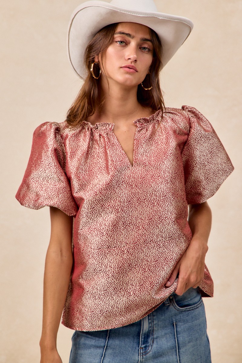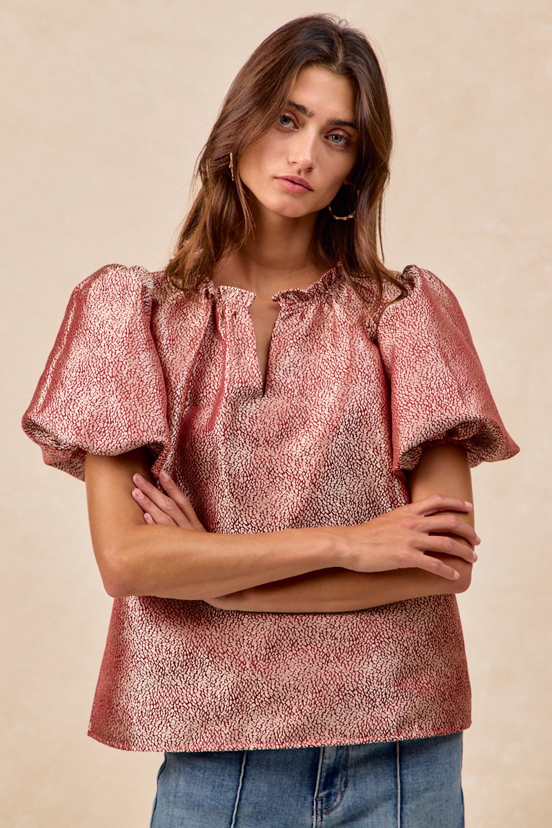 The Jacquard Woven Short Balloon Sleeves V Neck Top is a sophisticated and stylish piece that elevates any outfit. The jacquard woven fabric adds a touch of texture and elegance to the top, making it a versatile choice for both casual and dressy occasions. With short balloon sleeves and a flattering V-neckline, this top offers a trendy and feminine look. The unique design details and craftsmanship make this top a standout piece in your wardrobe. Pair it with your favorite bottoms for a chic and fashion-forward ensemble that is sure to impress.