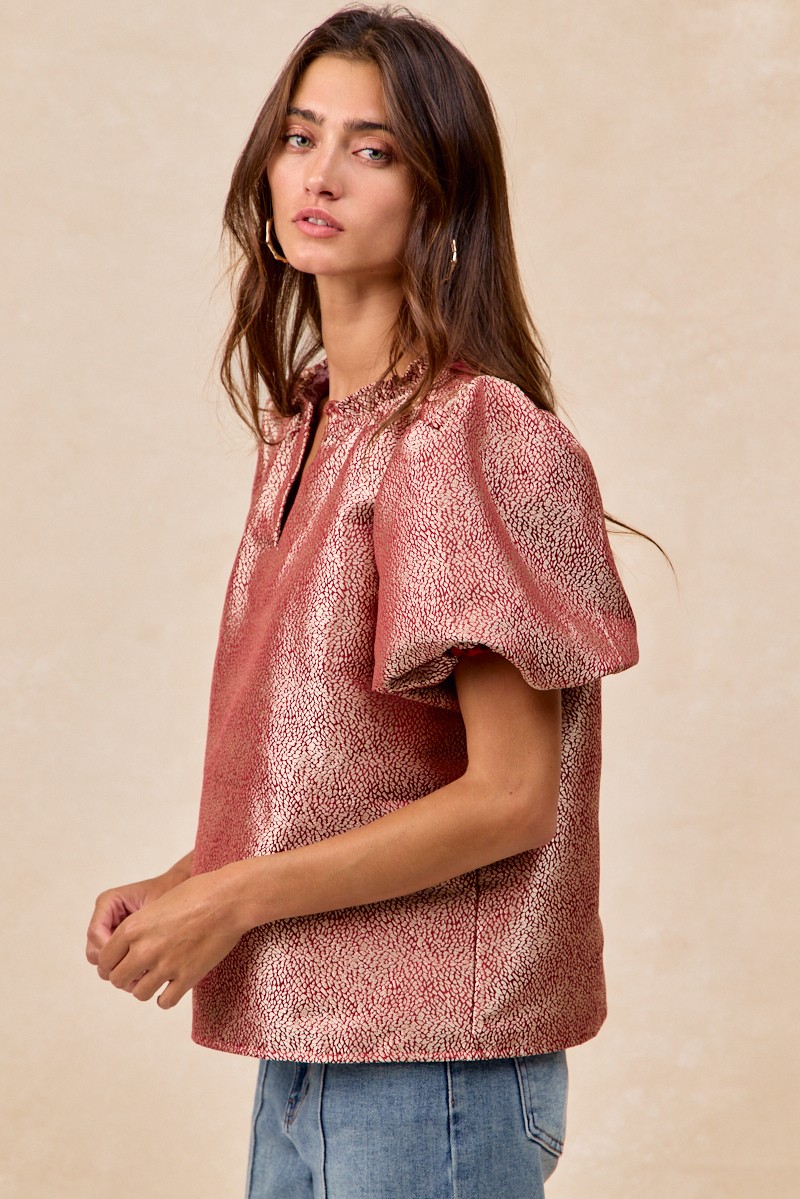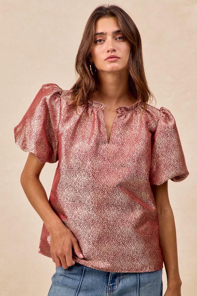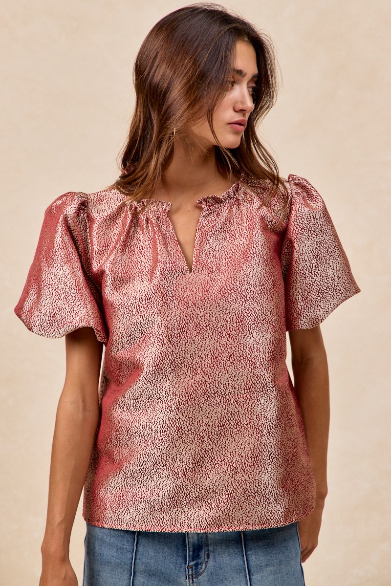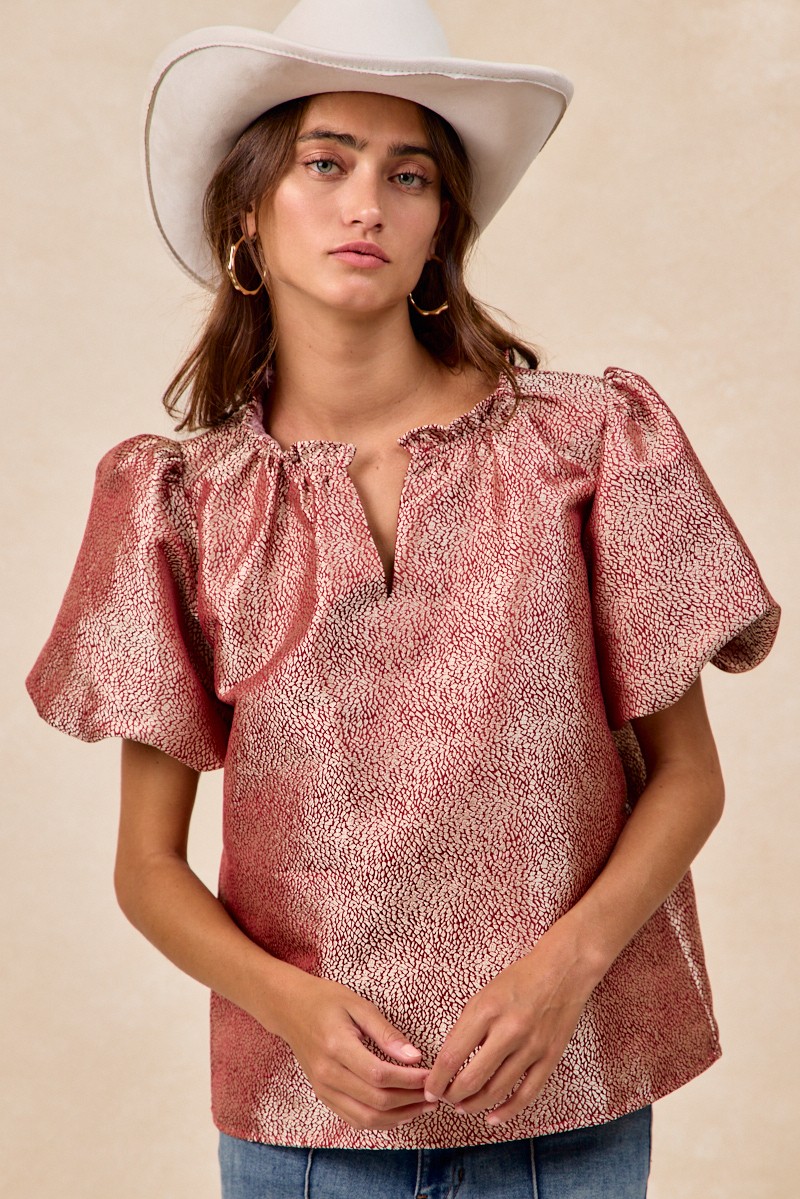 The Jacquard Woven Short Balloon Sleeves V Neck Top is a sophisticated and stylish piece that elevates any outfit. The jacquard woven fabric adds a touch of texture and elegance to the top, making it a versatile choice for both casual and dressy occasions. With short balloon sleeves and a flattering V-neckline, this top offers a trendy and feminine look. The unique design details and craftsmanship make this top a standout piece in your wardrobe. Pair it with your favorite bottoms for a chic and fashion-forward ensemble that is sure to impress.